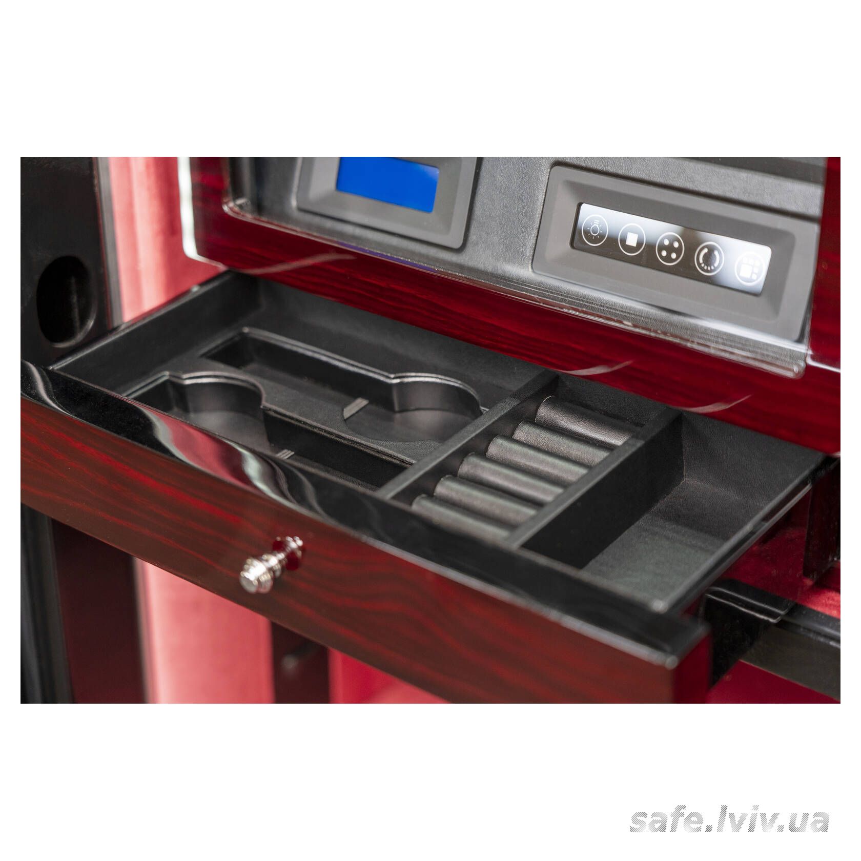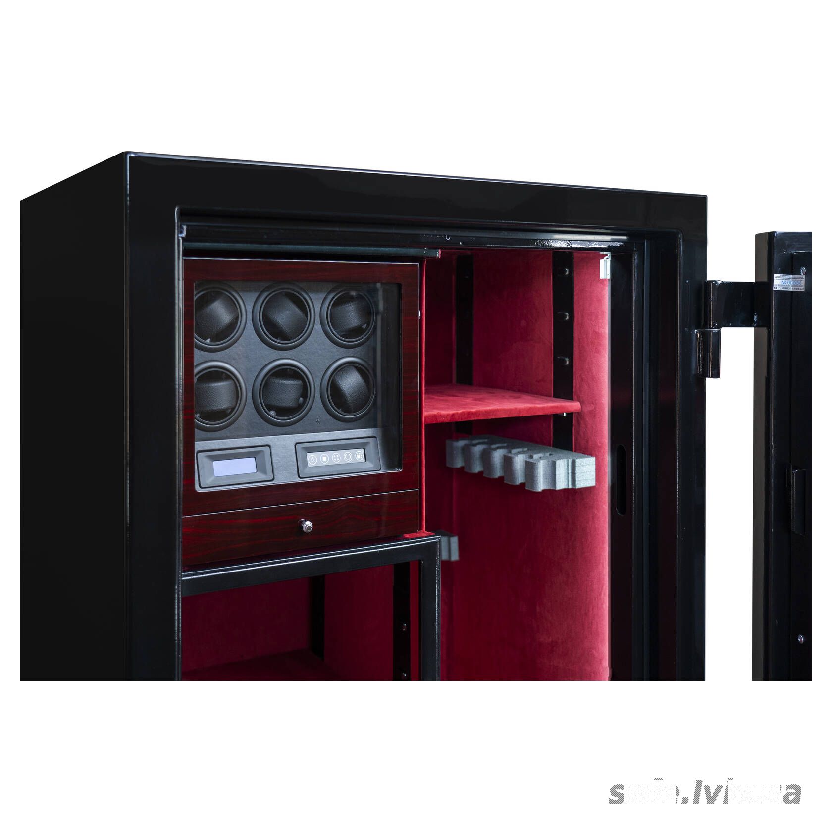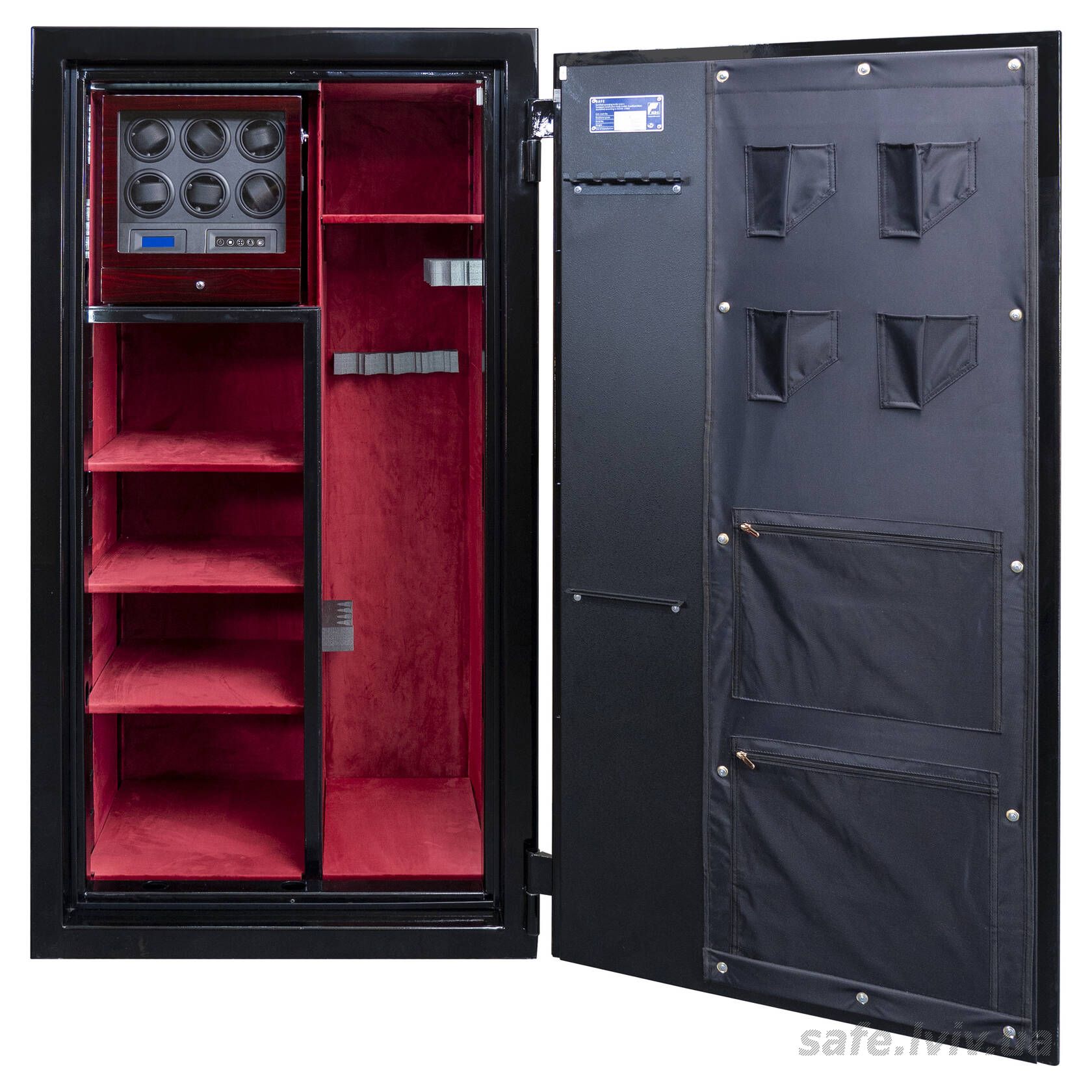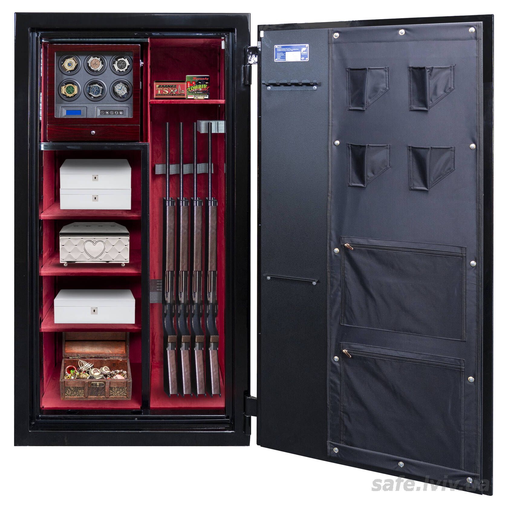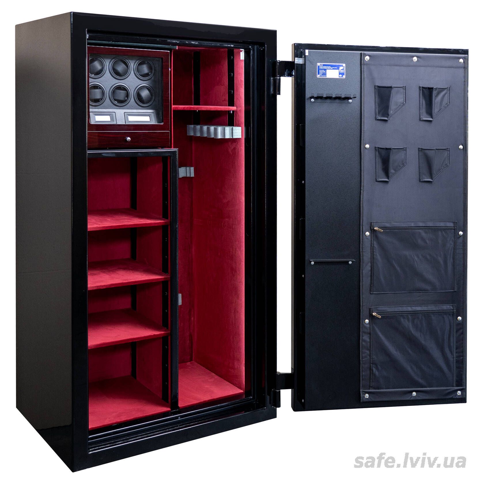 - Комплектація: пересувний ложемент під зброю з оптикою, тримачі для шомполів, внутрішнє оздоблення, віндер, 4 полиці; анкерні вузли для монтажу до підлоги.