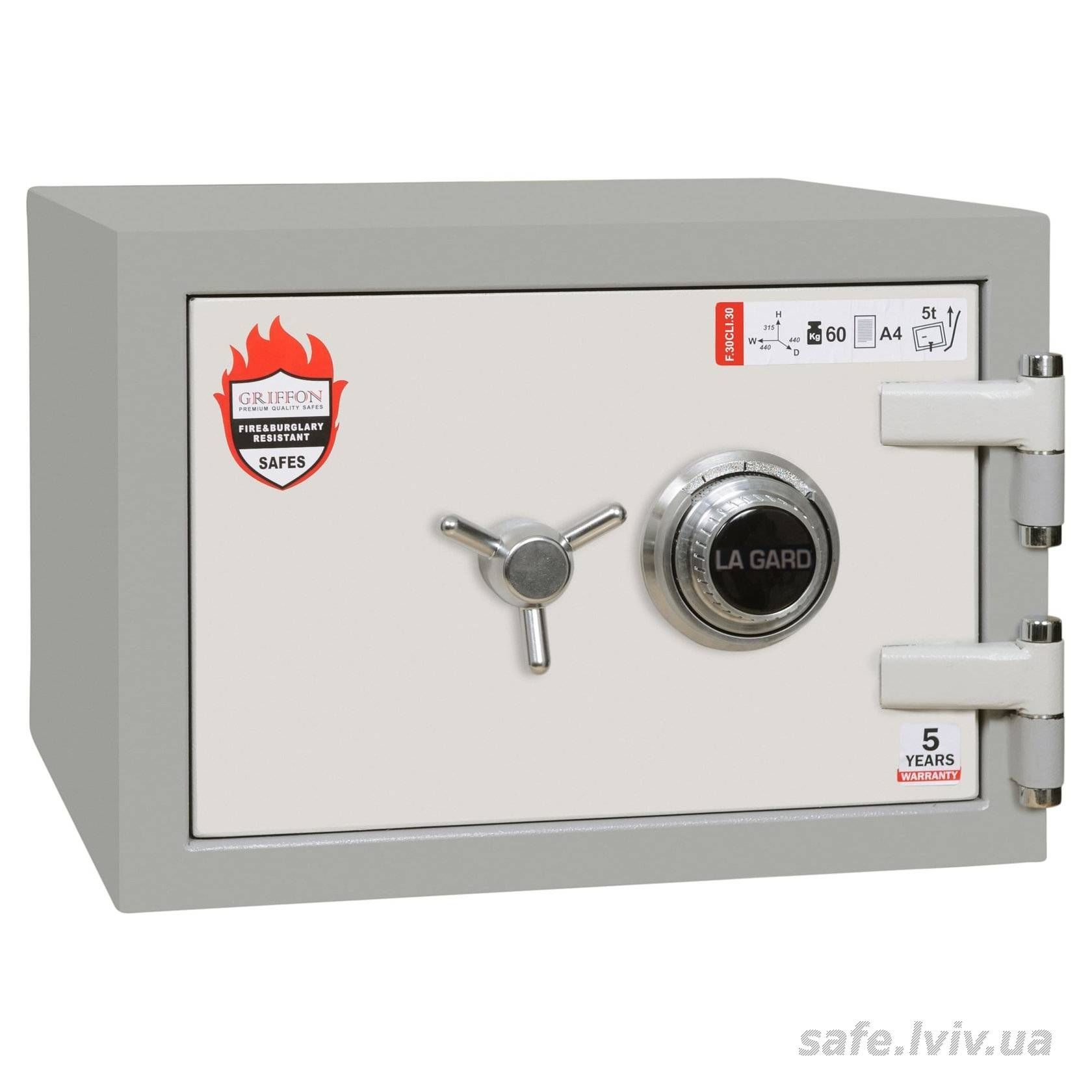 Griffon F.30.CL.I.30.C це сертифікований сейф клас I за EN 1143-1 та вогнестійкість LFS 30P за EN 15659, призначений для захисту від пожежі грошей, коштовностей і документів в офісах та приватних будинках. Зламостійкість забезпечує конструкція корпусу 55 мм (сталь - вогнестійкий бетон - сталь), дверей 95 мм (сталь - вогнестійкий бетон - сталь), ригельна система тристороння, 4 ригелі Ø 25 мм та замок - кодовий механічний La GARD (США) VdS Class 1 (A). Рекомендовані ліміти зберігання - до 2 000 мінімальних зарплат для особистого користування та до 1 000 для комерційного.