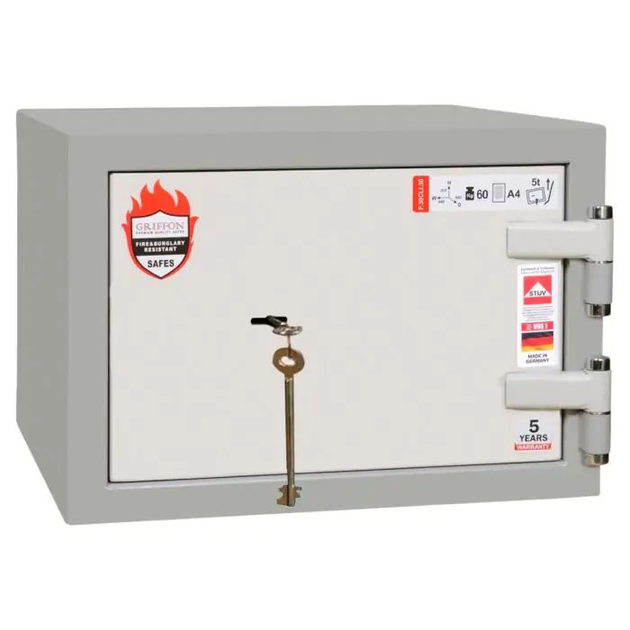 Griffon F.30.CL.I.30.K це сертифікований сейф клас I за EN 1143-1 та вогнестійкість LFS 30P за EN 15659, призначений для захисту від пожежі грошей, коштовностей і документів в офісах та приватних будинках. Зламостійкість забезпечує конструкція корпусу 55 мм (сталь - вогнестійкий бетон - сталь), дверей 95 мм (сталь - вогнестійкий бетон - сталь), ригельна система тристороння, 5 ригелів Ø 25 мм та замок - ключовий STUV (Німеччина) VdS Class 1 (A). Рекомендовані ліміти зберігання - до 2 000 мінімальних зарплат для особистого користування та до 1 000 для комерційного.