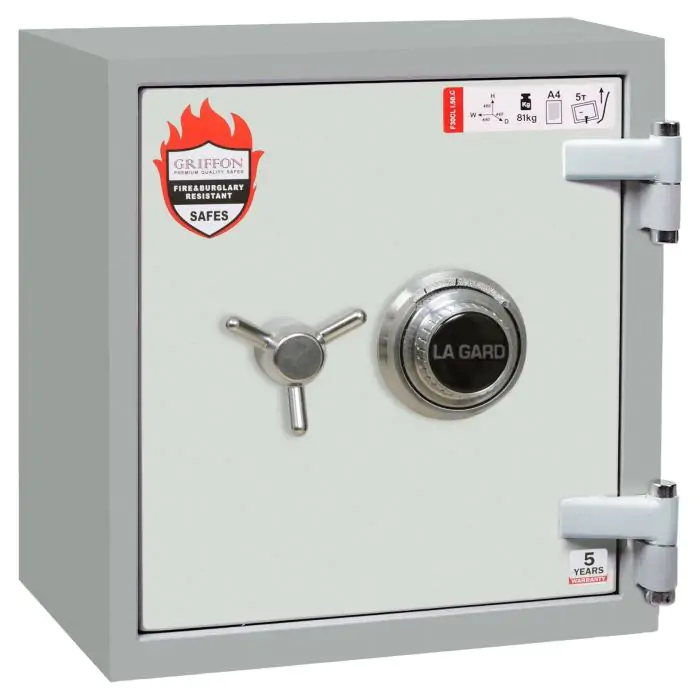 Griffon F.30.CL.I.50.C це сертифікований сейф клас I за EN 1143-1 та вогнестійкість LFS 30P за EN 15659, призначений для захисту від пожежі грошей, коштовностей і документів в офісах та приватних будинках. Зламостійкість забезпечує конструкція корпусу 55 мм (сталь - вогнестійкий бетон - сталь), дверей 95 мм (сталь - вогнестійкий бетон - сталь), ригельна система тристороння, 5 ригелів Ø 25 мм та замок - кодовий механічний La GARD (США) VdS Class 1 (A). Рекомендовані ліміти зберігання - до 2 000 мінімальних зарплат для особистого користування та до 1 000 для комерційного.