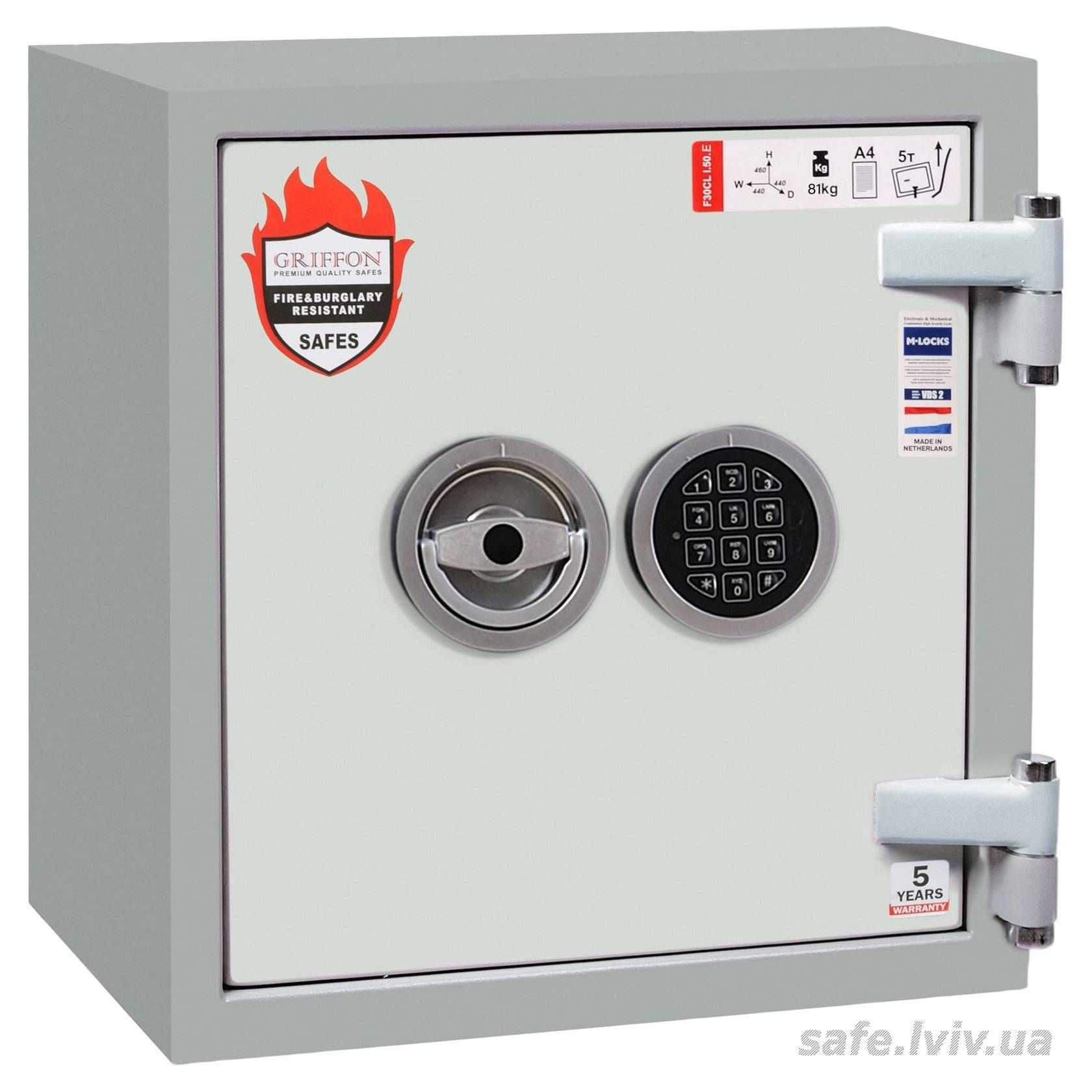 Griffon F.30.CL.I.50.E це сертифікований сейф клас I за EN 1143-1 та вогнестійкість LFS 30P за EN 15659, призначений для захисту від пожежі грошей, коштовностей і документів в офісах та приватних будинках. Зламостійкість забезпечує конструкція корпусу 55 мм (сталь - вогнестійкий бетон - сталь), дверей 95 мм (сталь - вогнестійкий бетон - сталь), ригельна система тристороння, 5 ригелів Ø 25 мм та замок - електронний M-LOCKS (Нідерланди) VdS Class 2 (B). Рекомендовані ліміти зберігання - до 2 000 мінімальних зарплат для особистого користування та до 1 000 для комерційного.