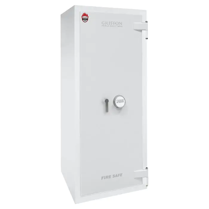 Griffon F.60.CL.I.150.E.T White це сертифікований сейф клас I за EN 1143-1 та вогнестійкість LFS 60P за EN 15659, призначений для захисту від пожежі грошей, документів і коштовностей у домі чи офісі. Захист забезпечують конструкція корпусу 72 мм (сталь - вогнестійкий бетон - сталь), дверей 140 мм (сталь - вогнестійкий бетон - сталь), ригельна система тристороння, 7 ригелів Ø 25 мм та замок електронний M-LOCKS (Нідерланди) VdS Class 2 (B).