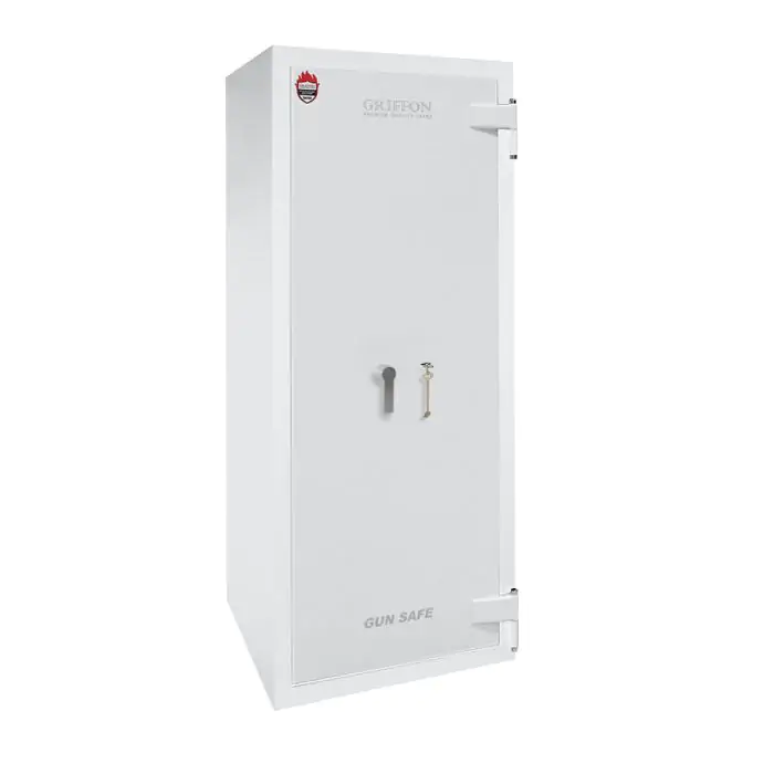 Griffon F.60.CL.I.150.K Gun White це сертифікований сейф клас I за EN 1143-1 та вогнестійкість LFS 60P за EN 15659, призначений для захисту від пожежі грошей, документів і коштовностей у домі чи офісі. Захист забезпечують конструкція корпусу 72 мм (сталь - вогнестійкий бетон - сталь), дверей 140 мм (сталь - вогнестійкий бетон - сталь), ригельна система тристороння, 5 ригелів Ø 25 мм та замок ключовий STUV (Німеччина) VdS Class 1 (A).