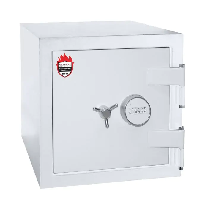Griffon F.60.CL.I.51.E.T White це сертифікований сейф клас I за EN 1143-1 та вогнестійкість LFS 60P за EN 15659, призначений для захисту від пожежі грошей, документів і коштовностей у домі чи офісі. Захист забезпечують конструкція корпусу 72 мм (сталь - вогнестійкий бетон - сталь), дверей 140 мм (сталь - вогнестійкий бетон - сталь), ригельна система тристороння, 7 ригелів Ø 25 мм та замок електронний M-LOCKS (Нідерланди) VdS Class 2 (B).