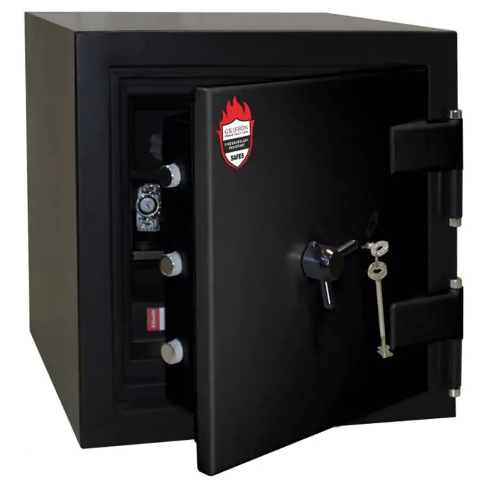 Griffon F.60.CL.I.51.K.T Black це сертифікований сейф клас I за EN 1143-1 та вогнестійкість LFS 60P за EN 15659, призначений для захисту від пожежі грошей, документів і коштовностей у домі чи офісі. Захист забезпечують конструкція корпусу 72 мм (сталь - вогнестійкий бетон - сталь), дверей 140 мм (сталь - вогнестійкий бетон - сталь), ригельна система тристороння, 7 ригелів Ø 25 мм та замок ключовий STUV (Німеччина) VdS Class 1 (A).