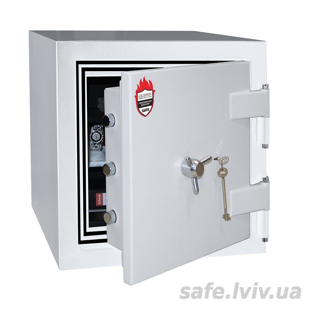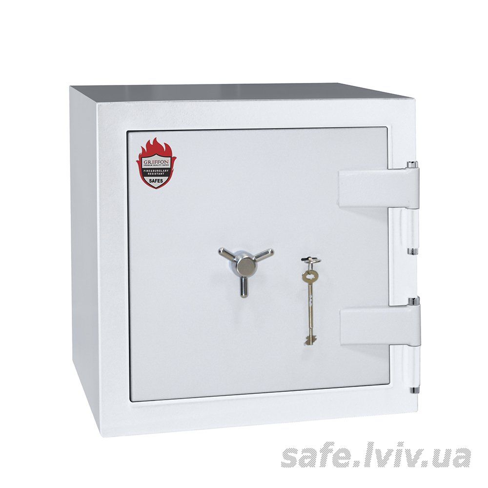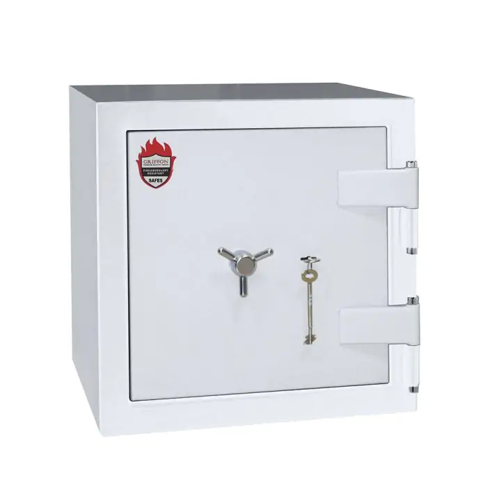 Griffon F.60.CL.I.51.K.T White це сертифікований сейф клас I за EN 1143-1 та вогнестійкість LFS 60P за EN 15659, призначений для захисту від пожежі грошей, документів і коштовностей у домі чи офісі. Захист забезпечують конструкція корпусу 72 мм (сталь - вогнестійкий бетон - сталь), дверей 140 мм (сталь - вогнестійкий бетон - сталь), ригельна система тристороння, 7 ригелів Ø 25 мм та замок ключовий STUV (Німеччина) VdS Class 1 (A).
