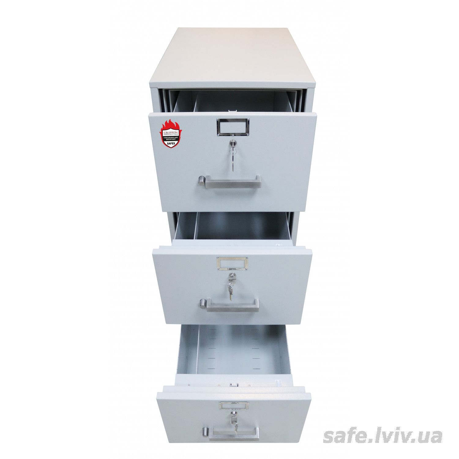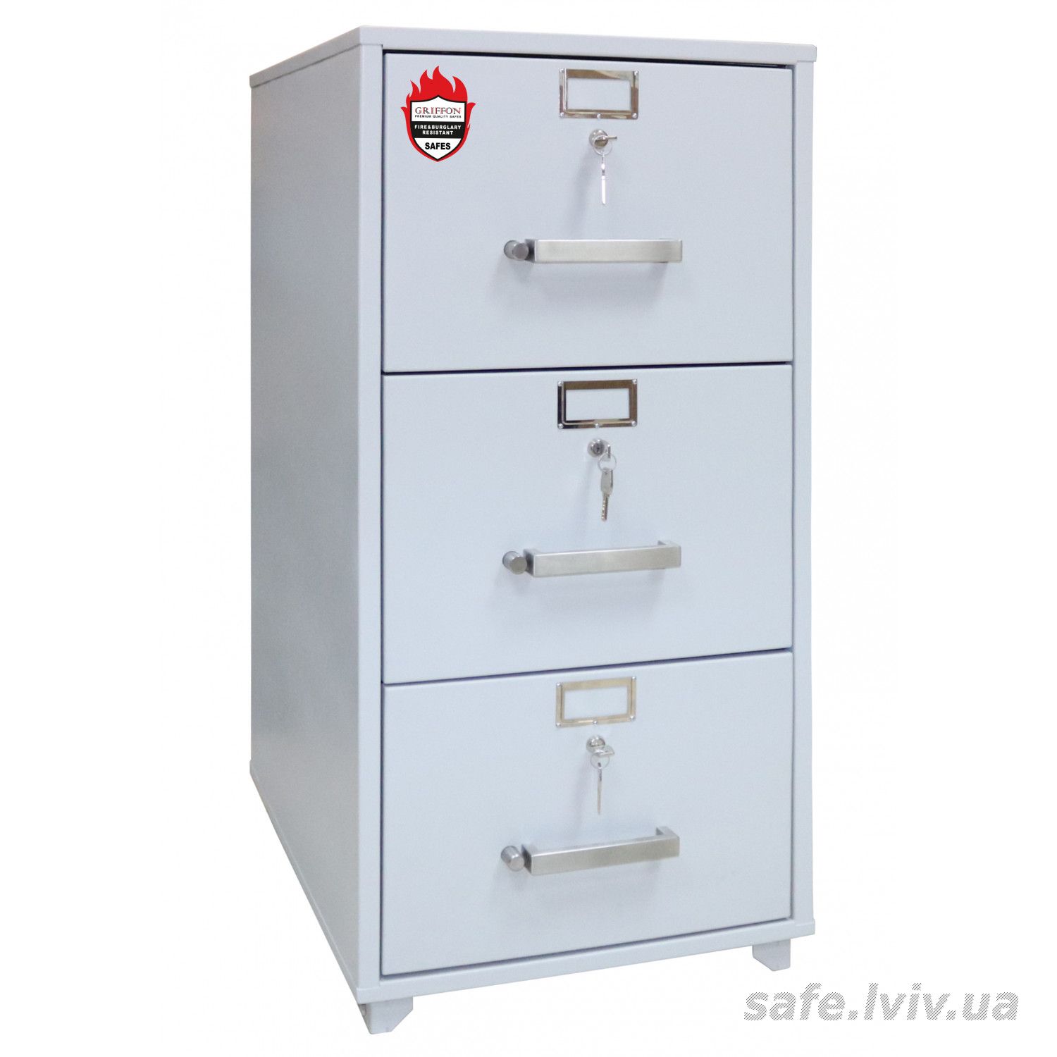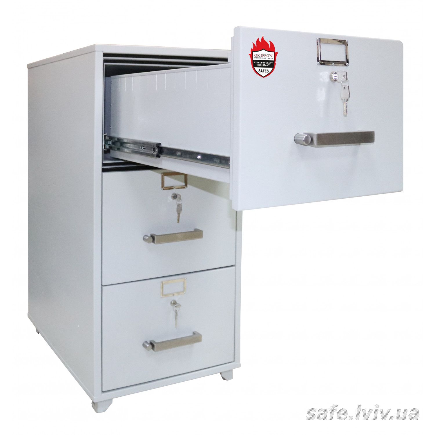 Griffon FF.3D.K це вогнестійка картотека для офісу, призначена для впорядкованого зберігання та захисту паперових документів від пожежі. Захист забезпечує конструкція корпусу , ригельна система двостороння, 2 ригелі Ø 16 мм та замок - ключовий EUROLOCKS (Польща). По периметру - подвійні термострічки. Комплектація - висувні ящики, колеса.
