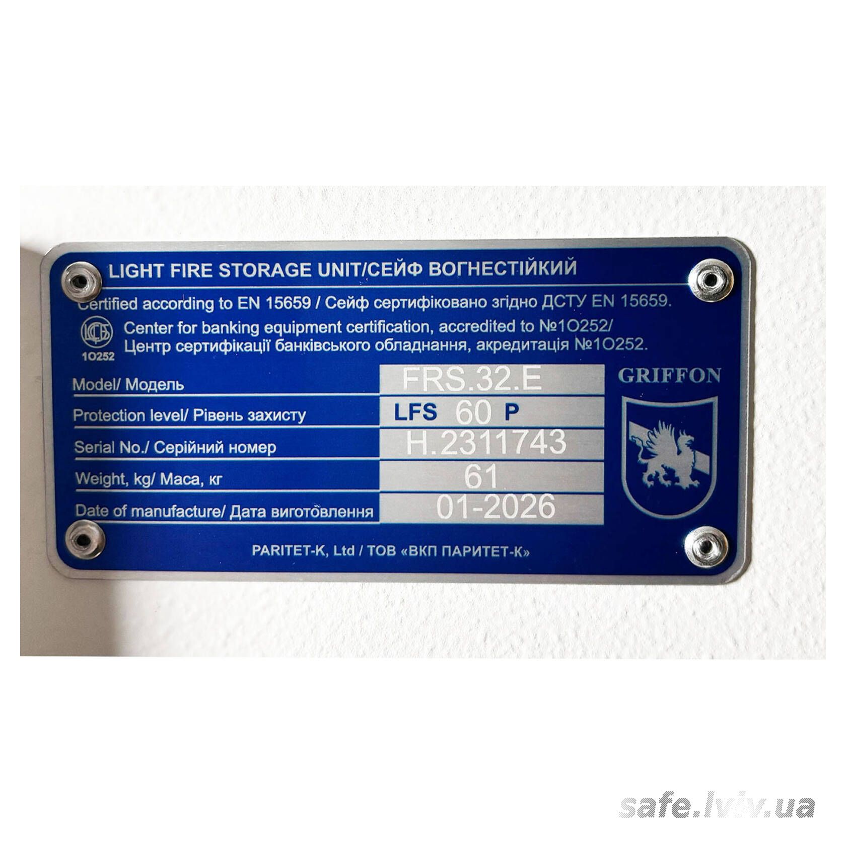Griffon FRS.32.E White це вогнестійкий, сертифікований за класом LFS 60P, сейф, призначений для захисту архівних документів і цінностей від пожежі. Конструкція корпусу 53 мм (сталь - вогнестійкий бетон - сталь), дверей 124 мм (сталь - вогнестійкий бетон - сталь), ригельна система одностороння. 2 ригелі діаметром 25 мм та замок - електронний GRIFFON Q2. По периметру дверей - термострічка BASF (Німеччина).