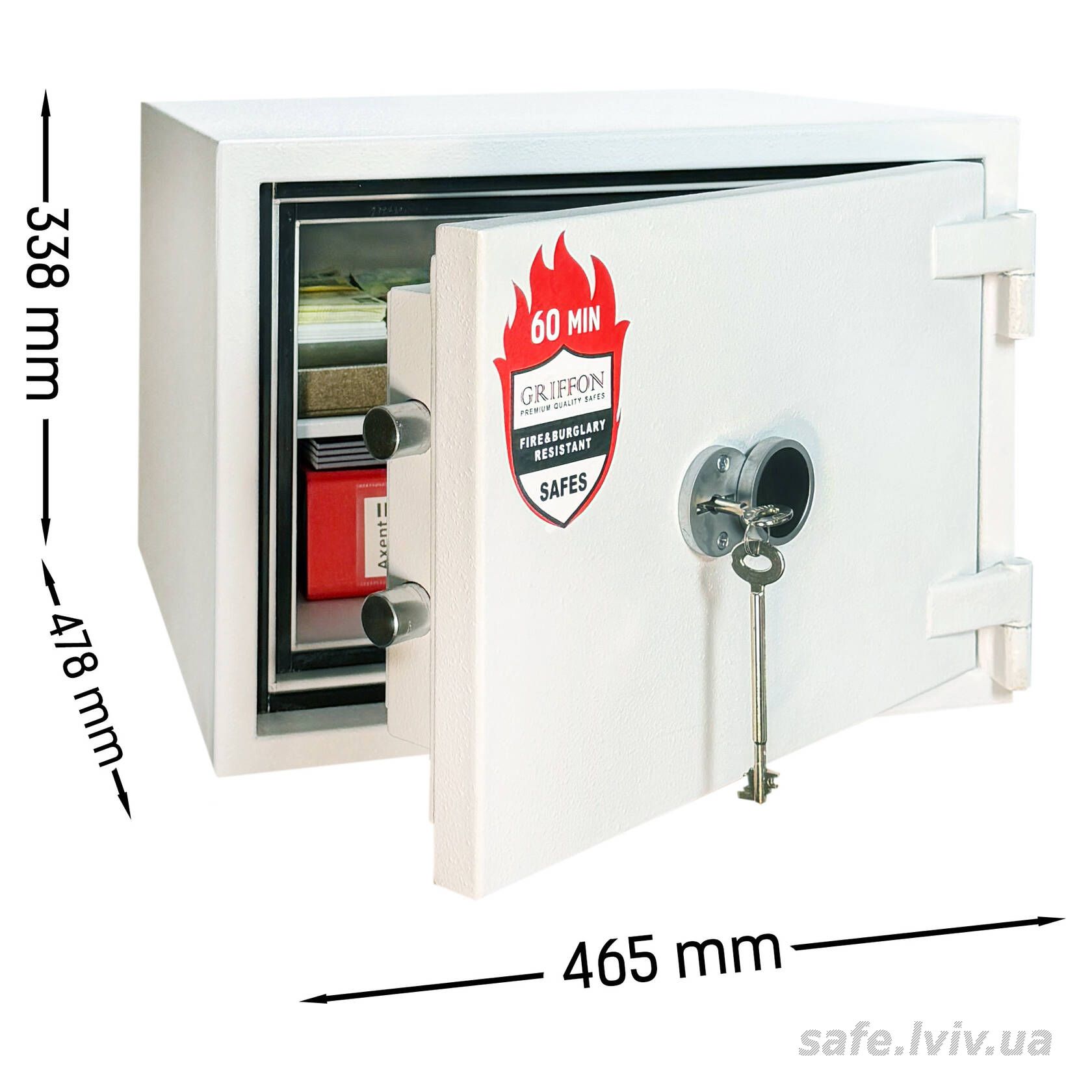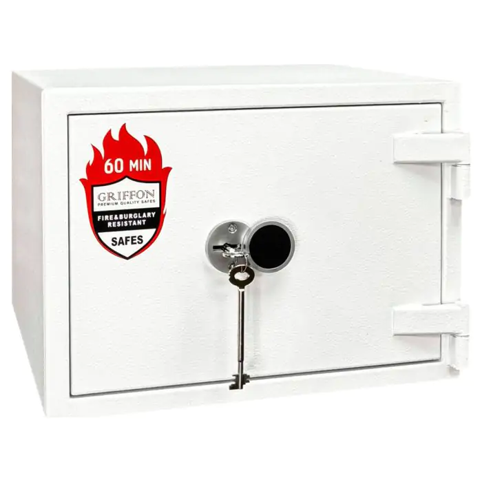 Griffon FRS.32.K White це вогнестійкий, сертифікований за класом LFS 60P, сейф, призначений для захисту архівних документів і цінностей від пожежі. Конструкція корпусу 53 мм (сталь - вогнестійкий бетон - сталь), дверей 124 мм (сталь - вогнестійкий бетон - сталь), ригельна система одностороння. 2 ригелі діаметром 25 мм та замок - ключовий WITTKOPP (Німеччина) VDS 1 (A). По периметру дверей - термострічка BASF (Німеччина).