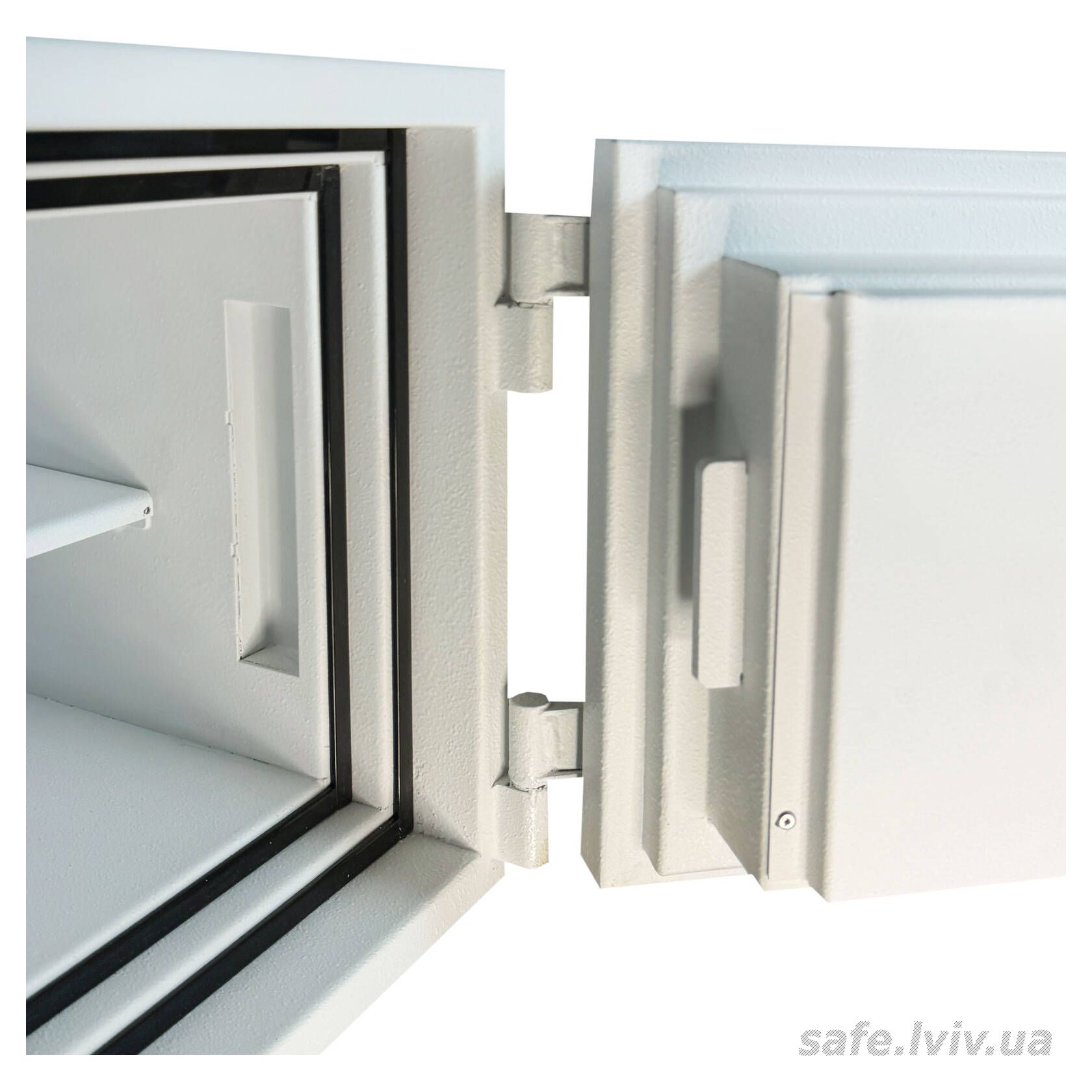 - Конструкція: корпус 53 мм (сталь - вогнестійкий бетон - сталь), двері 124 мм (сталь - вогнестійкий бетон - сталь); ригельна система одностороння. 2 ригелі діаметром 25 мм.