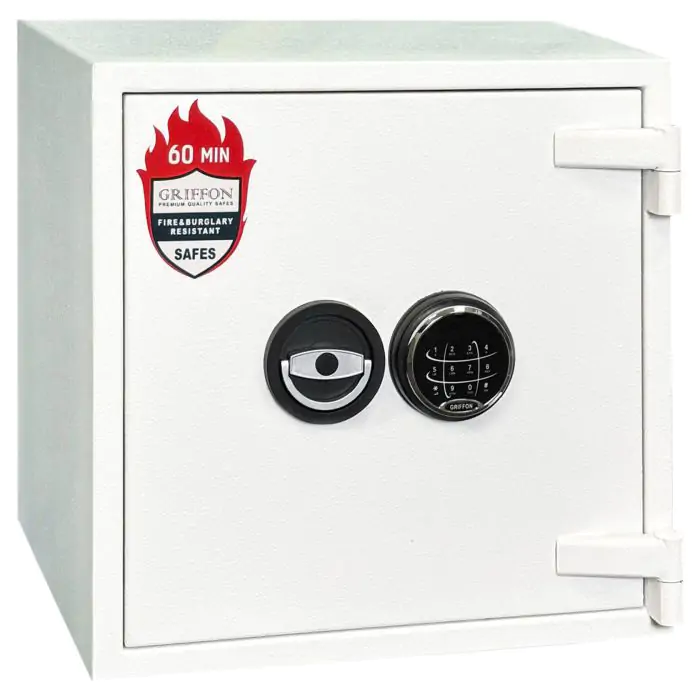 Griffon FRS.45.E White це вогнестійкий, сертифікований за класом LFS 60P, сейф, призначений для захисту архівних документів і цінностей від пожежі. Конструкція корпусу 53 мм (сталь - вогнестійкий бетон - сталь), дверей 124 мм (сталь - вогнестійкий бетон - сталь), ригельна система одностороння. 3 ригелі діаметром 25 мм та замок - електронний GRIFFON Q2. По периметру дверей - термострічка BASF (Німеччина).