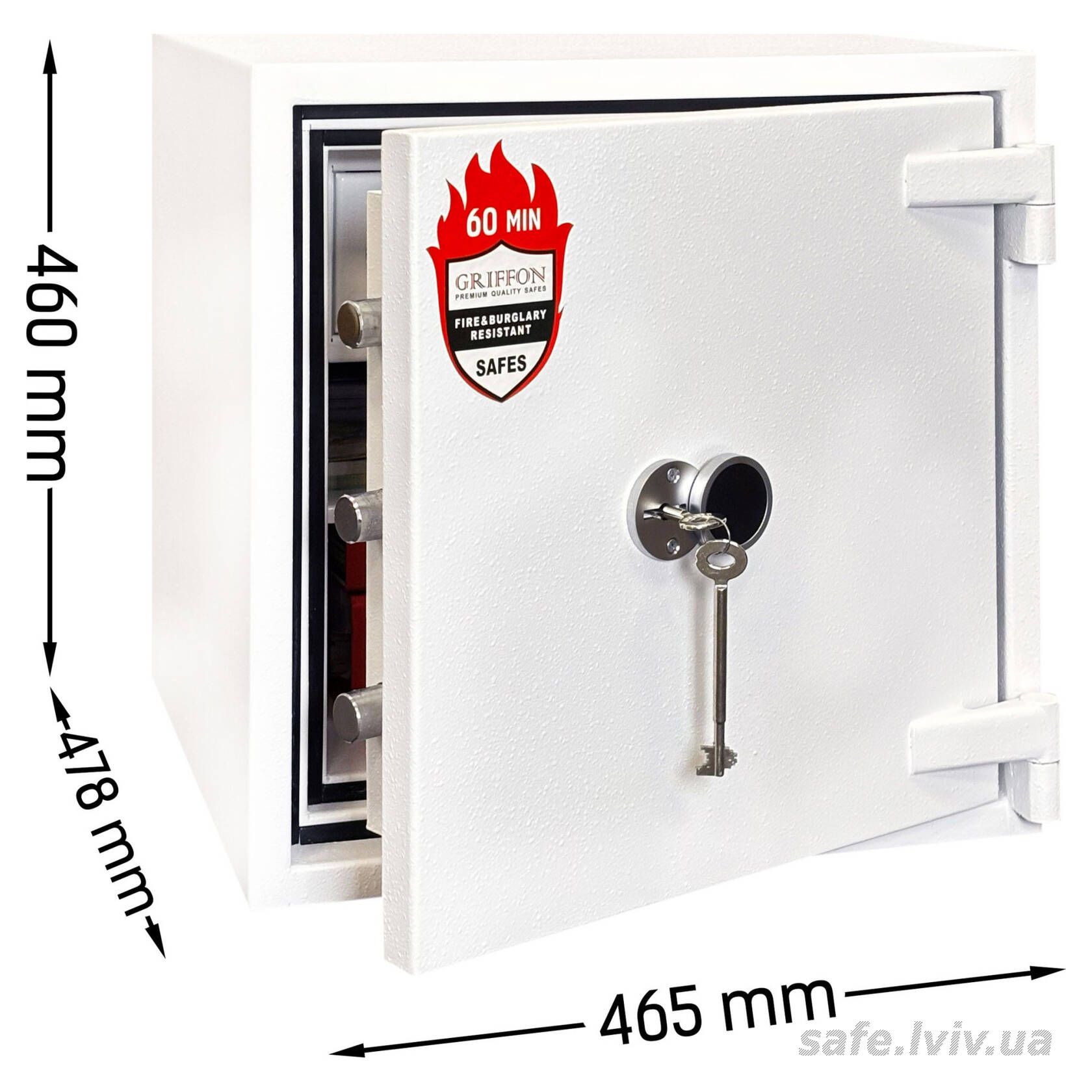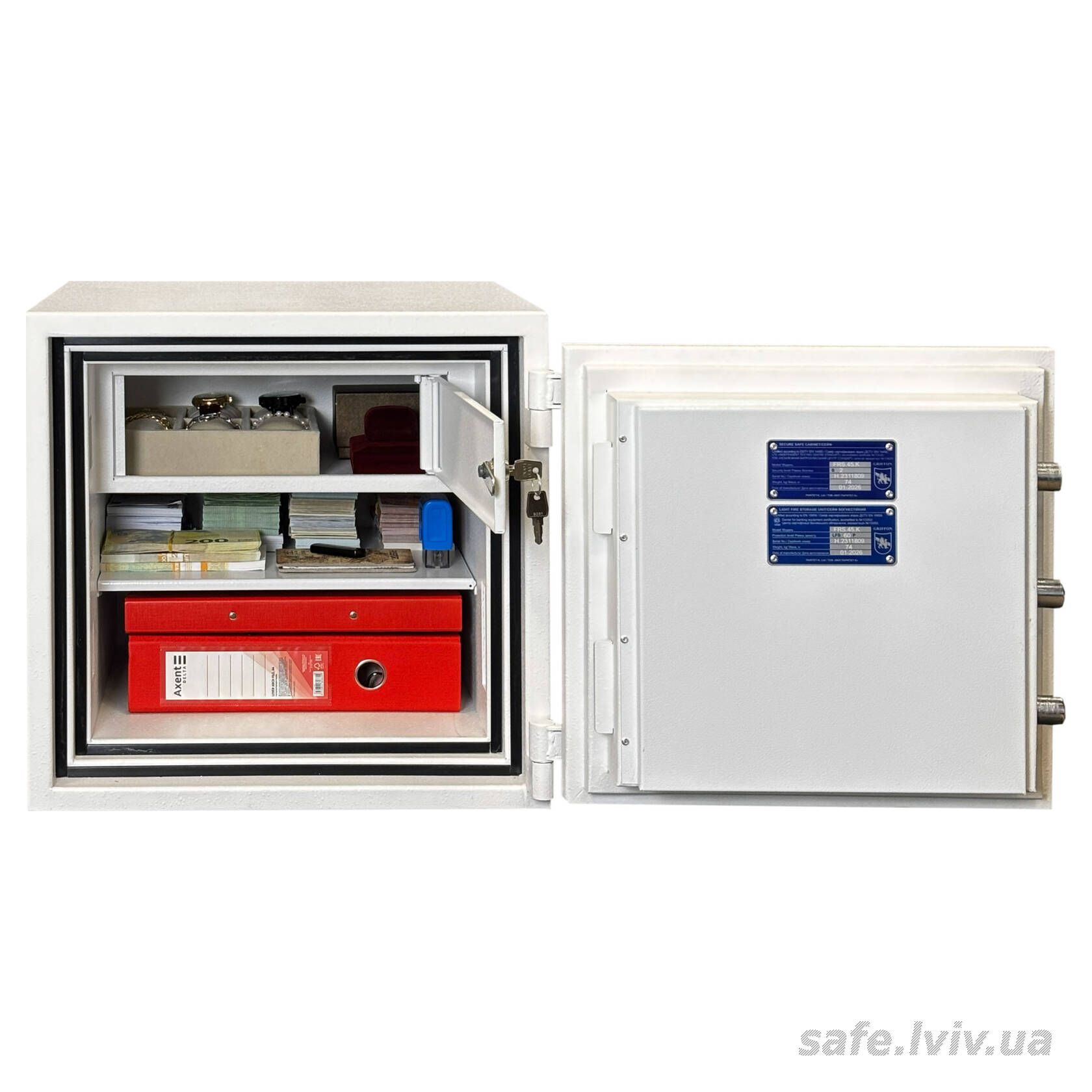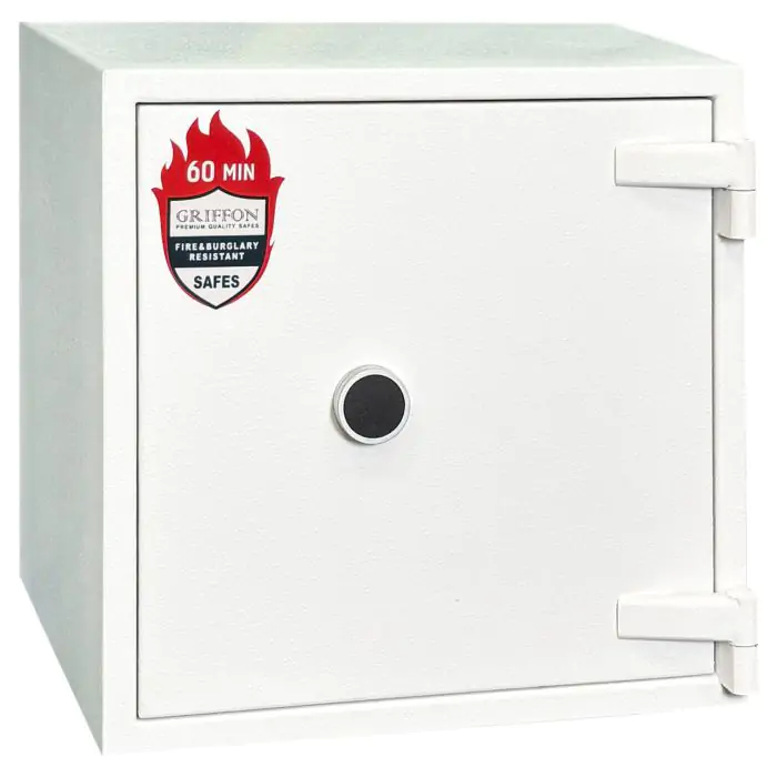Griffon FRS.45.K White це вогнестійкий, сертифікований за класом LFS 60P, сейф, призначений для захисту архівних документів і цінностей від пожежі. Конструкція корпусу 53 мм (сталь - вогнестійкий бетон - сталь), дверей 124 мм (сталь - вогнестійкий бетон - сталь), ригельна система одностороння. 3 ригелі діаметром 25 мм та замок - ключовий WITTKOPP (Німеччина) VDS 1 (A). По периметру дверей - термострічка BASF (Німеччина).