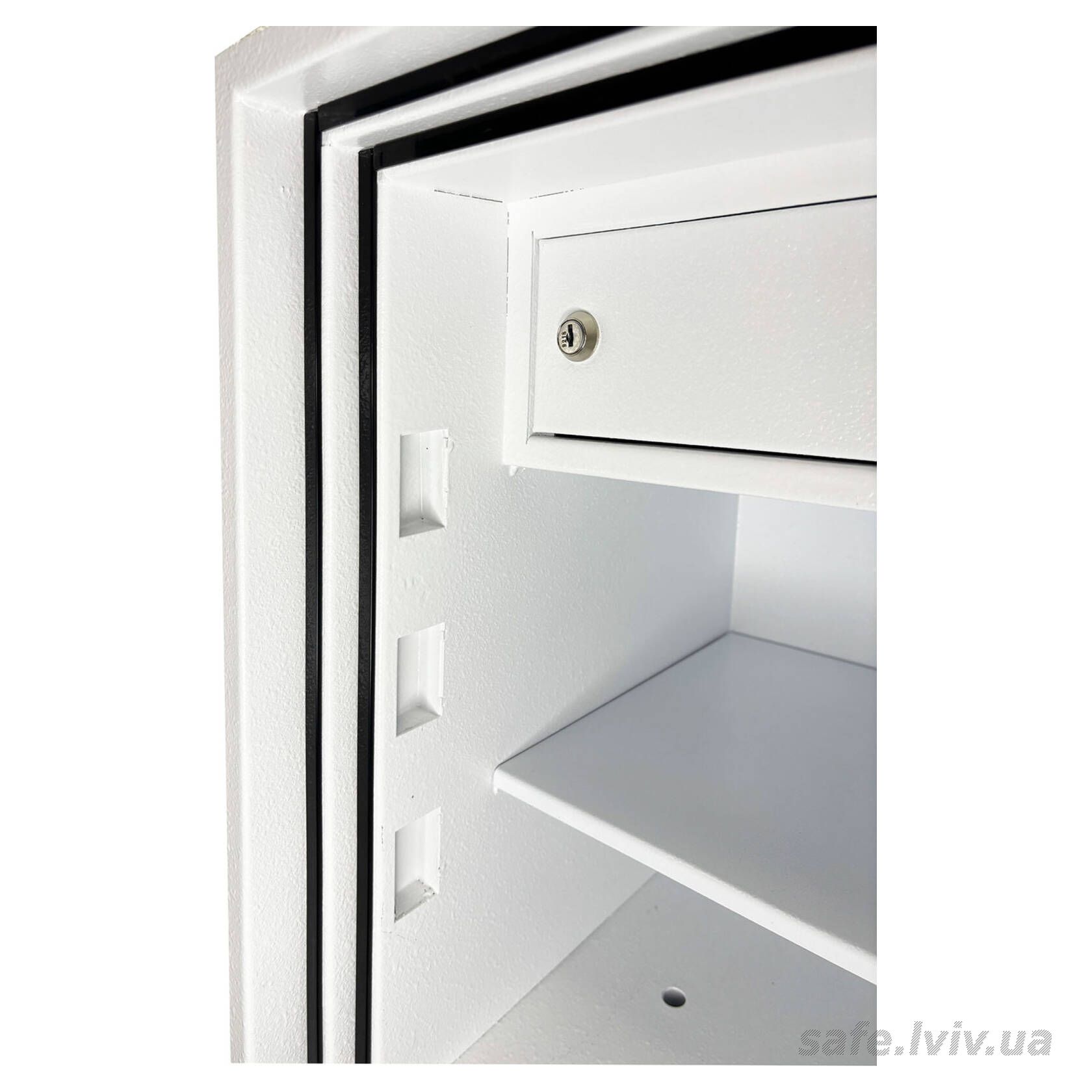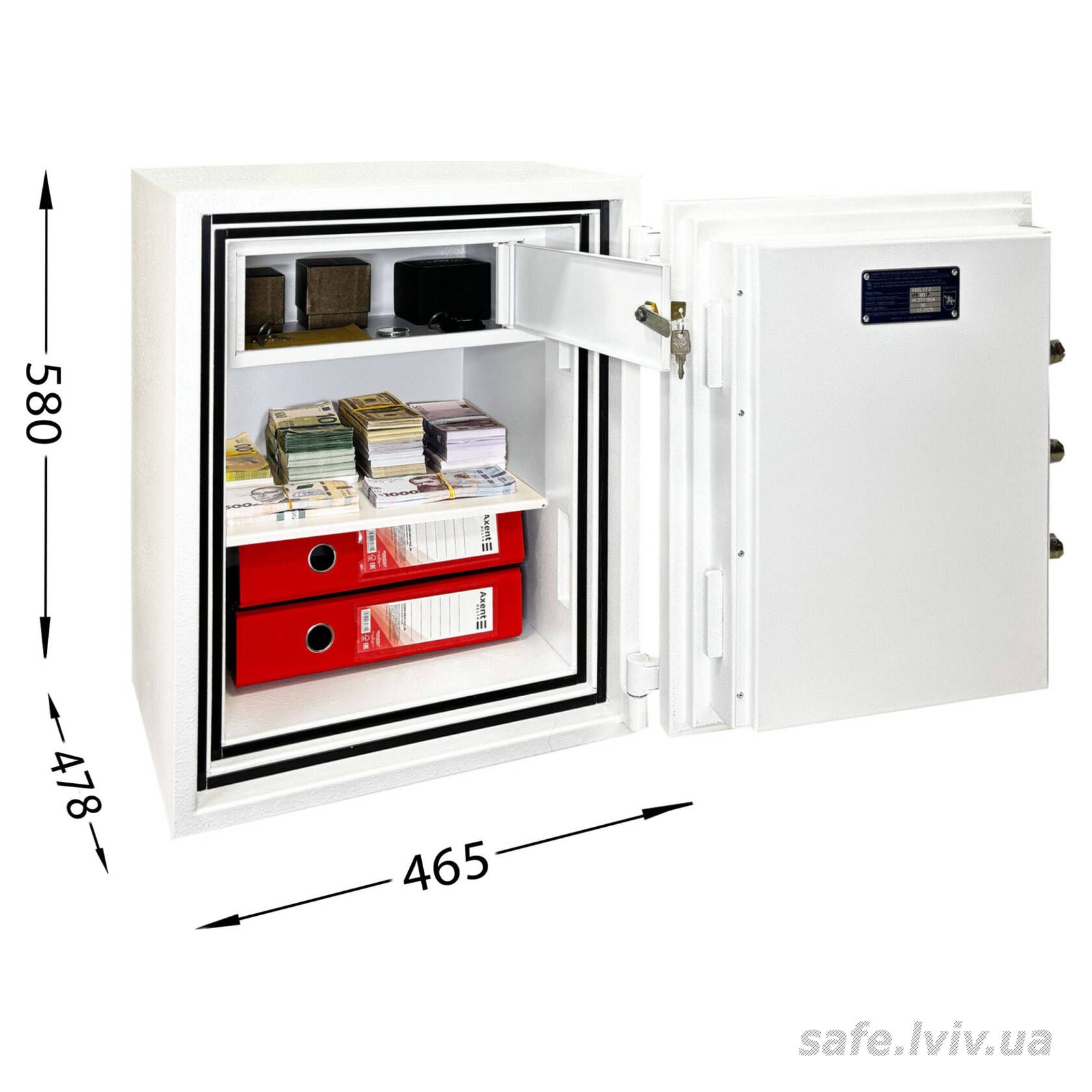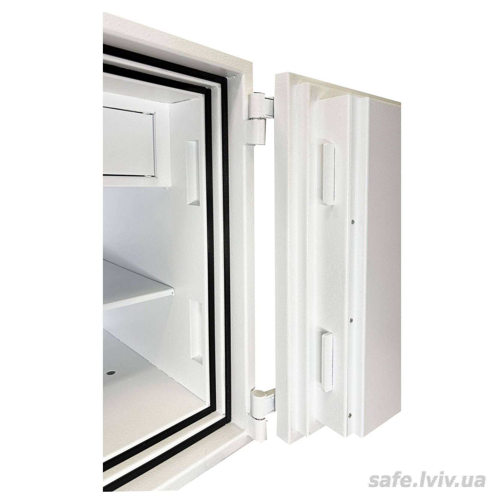 Griffon FRS.57.E White це вогнестійкий, сертифікований за класом LFS 60P, сейф, призначений для захисту архівних документів і цінностей від пожежі. Конструкція корпусу 53 мм (сталь - вогнестійкий бетон - сталь), дверей 124 мм (сталь - вогнестійкий бетон - сталь), ригельна система одностороння. 3 ригелі діаметром 25 мм та замок - електронний GRIFFON Q2. По периметру дверей - термострічка BASF (Німеччина).