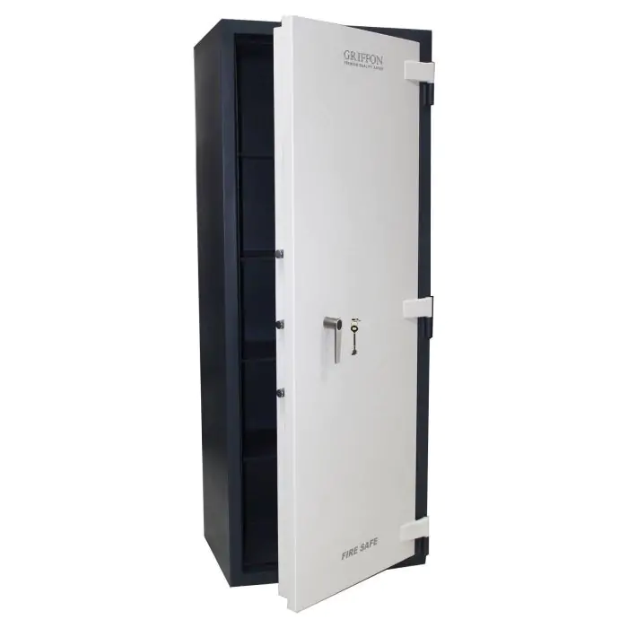 Griffon FS.180.K це вогнестійкий, сертифікований за класом LFS 30P, сейф, призначений для захисту документів, грошей і цінностей від пожежі вдома, в офісі та на підприємствах. Конструкція корпусу і дверей 43 мм (сталь - вогнестійкий бетон - сталь) та 99 мм (сталь - вогнестійкий бетон - сталь) у поєднанні з ригельною системою тристороння, 5 ригелів Ø 25 мм і сучасними замками забезпечує надійний рівень безпеки.