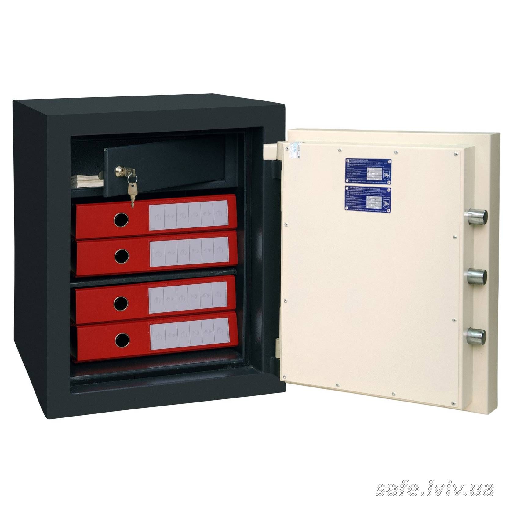Griffon FS.57.K це вогнестійкий, сертифікований за класом LFS 30P, сейф, призначений для захисту документів, грошей і цінностей від пожежі вдома, в офісі та на підприємствах. Конструкція корпусу і дверей 43 мм (сталь - вогнестійкий бетон - сталь) та 99 мм (сталь - вогнестійкий бетон - сталь) у поєднанні з ригельною системою одностороння, 3 ригелі Ø 25 мм і сучасними замками забезпечує надійний рівень безпеки.
