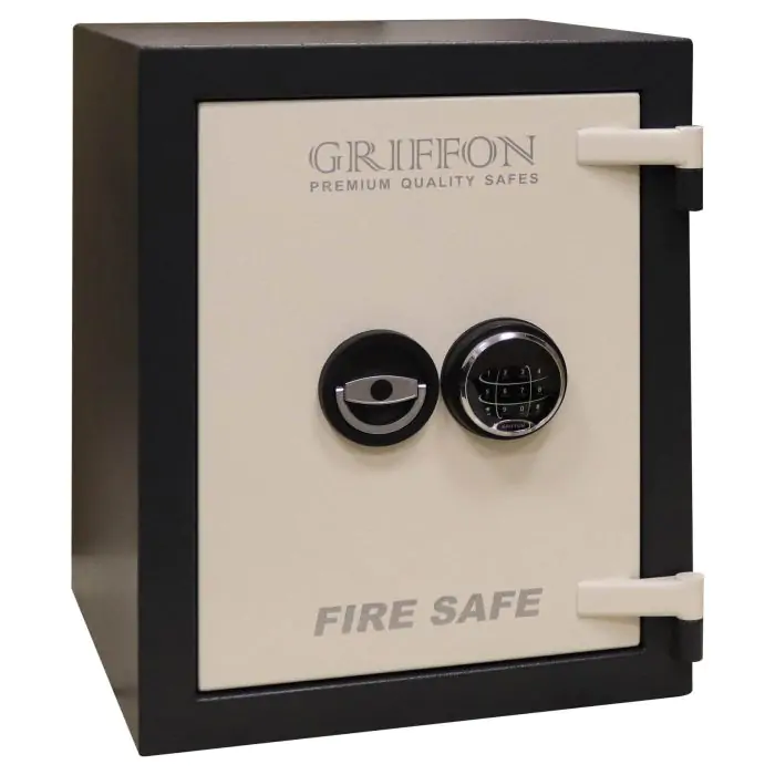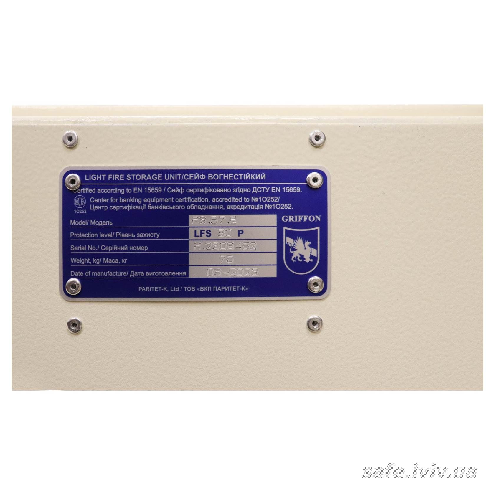Griffon FS.57.K.E це вогнестійкий, сертифікований за класом LFS 30P, сейф, призначений для захисту документів, грошей і цінностей від пожежі вдома, в офісі та на підприємствах. Конструкція корпусу і дверей 43 мм (сталь - вогнестійкий бетон - сталь) та 99 мм (сталь - вогнестійкий бетон - сталь) у поєднанні з ригельною системою одностороння, 3 ригелі Ø 25 мм і сучасними замками забезпечує надійний рівень безпеки.