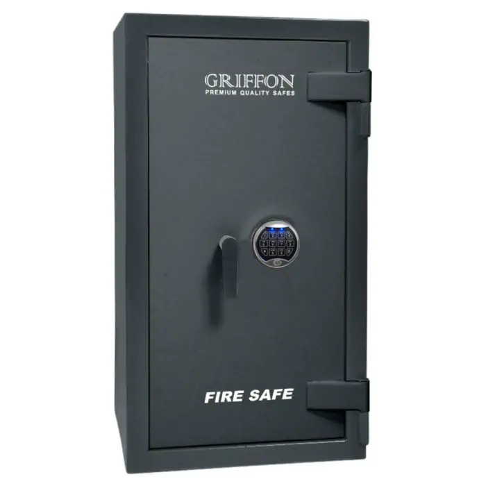 Griffon FS.90.E ML це вогнестійкий, сертифікований за класом LFS 30P, сейф, призначений для захисту документів, грошей і цінностей від пожежі вдома, в офісі та на підприємствах. Конструкція корпусу і дверей 43 мм (сталь - вогнестійкий бетон - сталь) та 99 мм (сталь - вогнестійкий бетон - сталь) у поєднанні з ригельною системою тристороння, 4 ригелі Ø 25 мм і сучасними замками забезпечує надійний рівень безпеки.