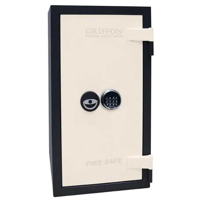 Griffon FS.90.K.E це вогнестійкий, сертифікований за класом LFS 30P, сейф, призначений для захисту документів, грошей і цінностей від пожежі вдома, в офісі та на підприємствах. Конструкція корпусу і дверей 43 мм (сталь - вогнестійкий бетон - сталь) та 99 мм (сталь - вогнестійкий бетон - сталь) у поєднанні з ригельною системою тристороння, 5 ригелів Ø 25 мм і сучасними замками забезпечує надійний рівень безпеки.