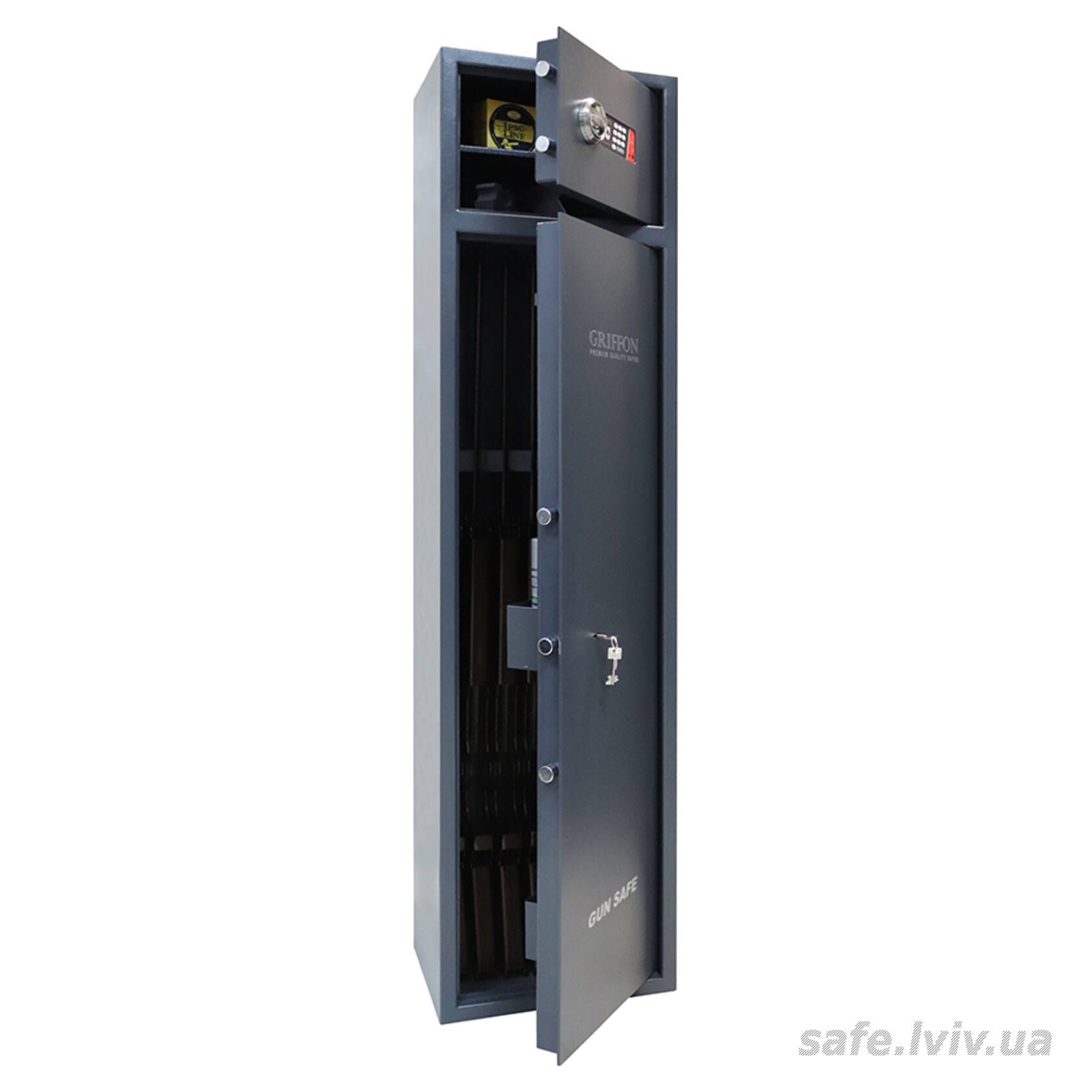Griffon G.170.E.K це сейф для зброї, призначений для безпечного зберігання мисливської та спортивної зброї. Конструкція корпусу 3 мм (сталь), дверей 6 мм (сталь), ригельна система тристороння, 4 ригелі Ø 25 мм з антизрізами. Замок - електронний Griffon 2.0 (Україна), ключовий STUV (Німеччина) VdS Class 1 (A). Місткість - 7 рушниць.