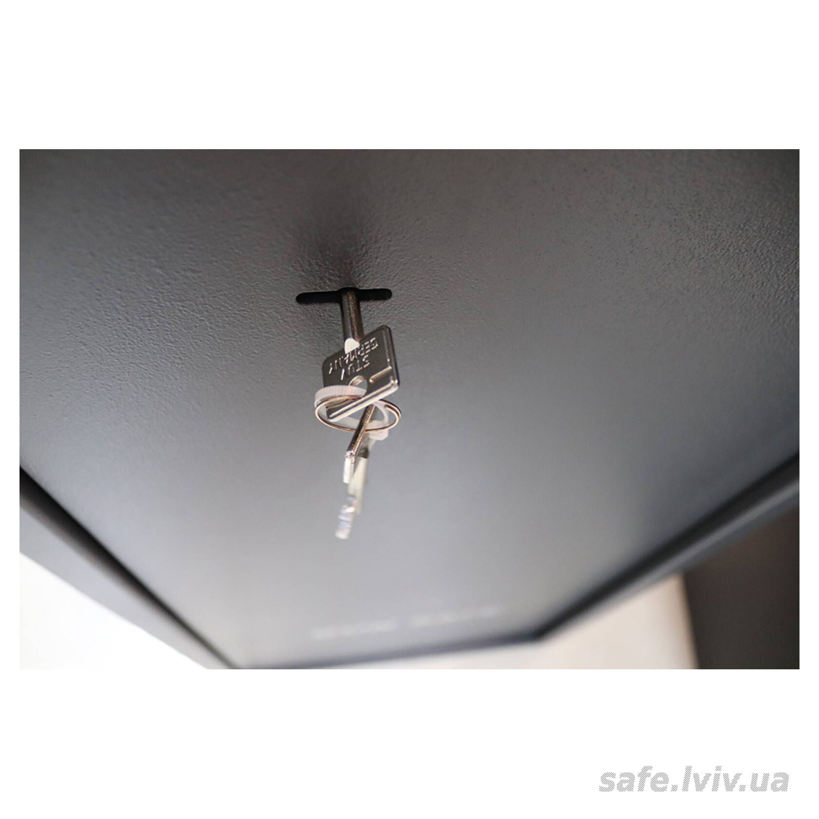 - Конструкція: корпус 3 мм (сталь), двері 6 мм (сталь); ригельна система тристороння, 4 ригелі Ø 25 мм.