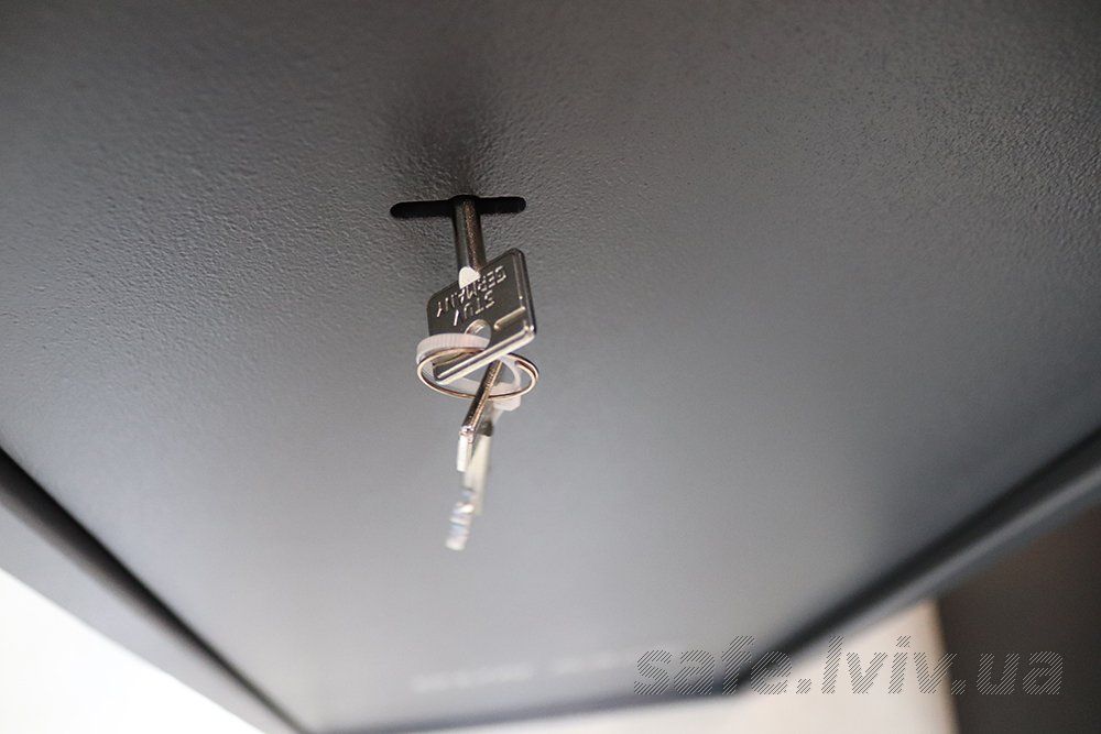 - Конструкція: корпус 3 мм (сталь), двері 6 мм (сталь); ригельна система тристороння, 4 ригелі Ø 25 мм.
