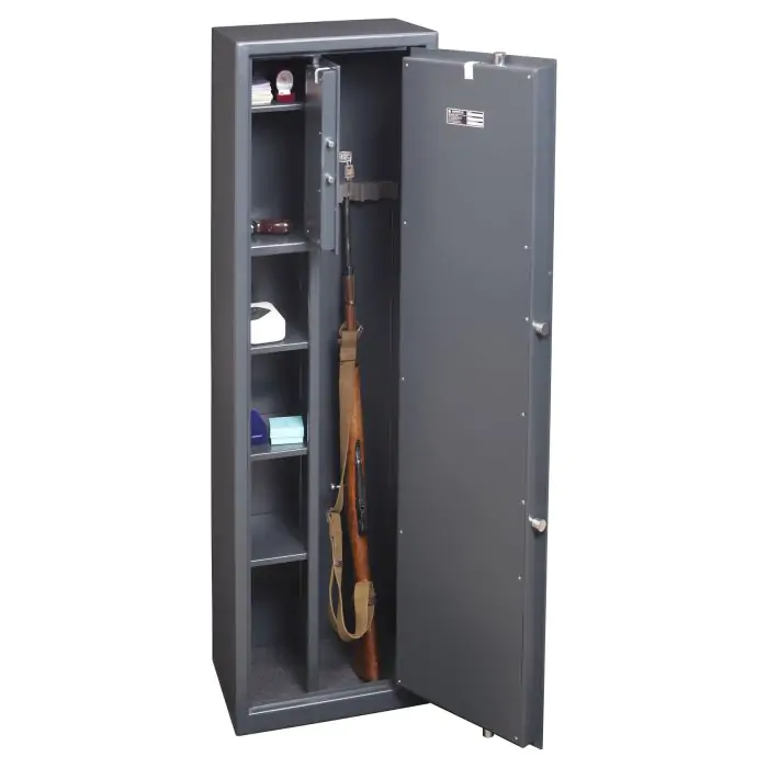 - Комплектація: тримачі для шомполів, зйомний магнітний ложемент, зйомні навісні елементи на дверях, 1 полиця; отвори для анкерування до стіни.