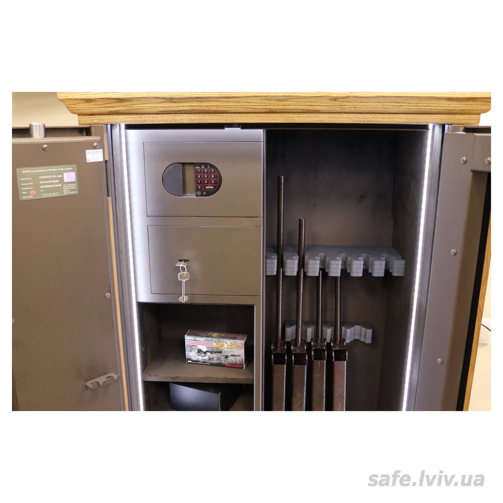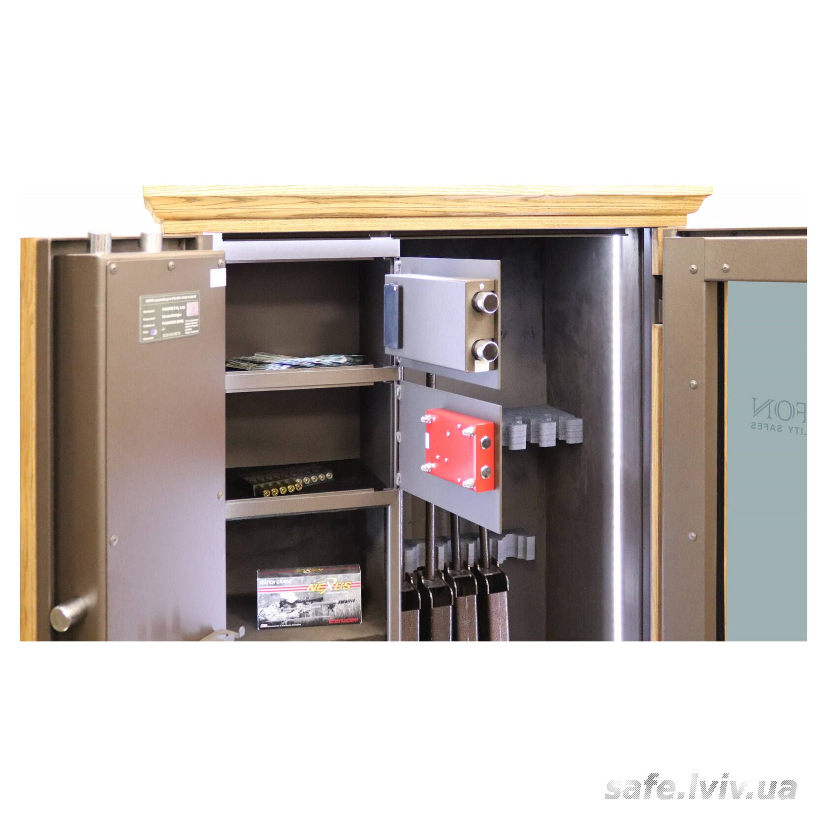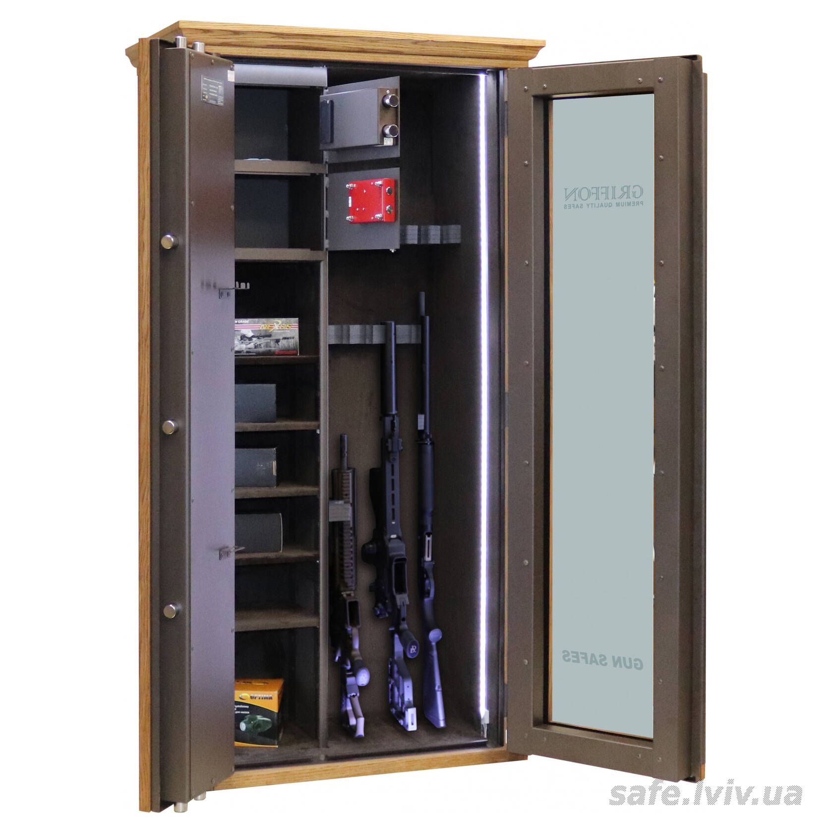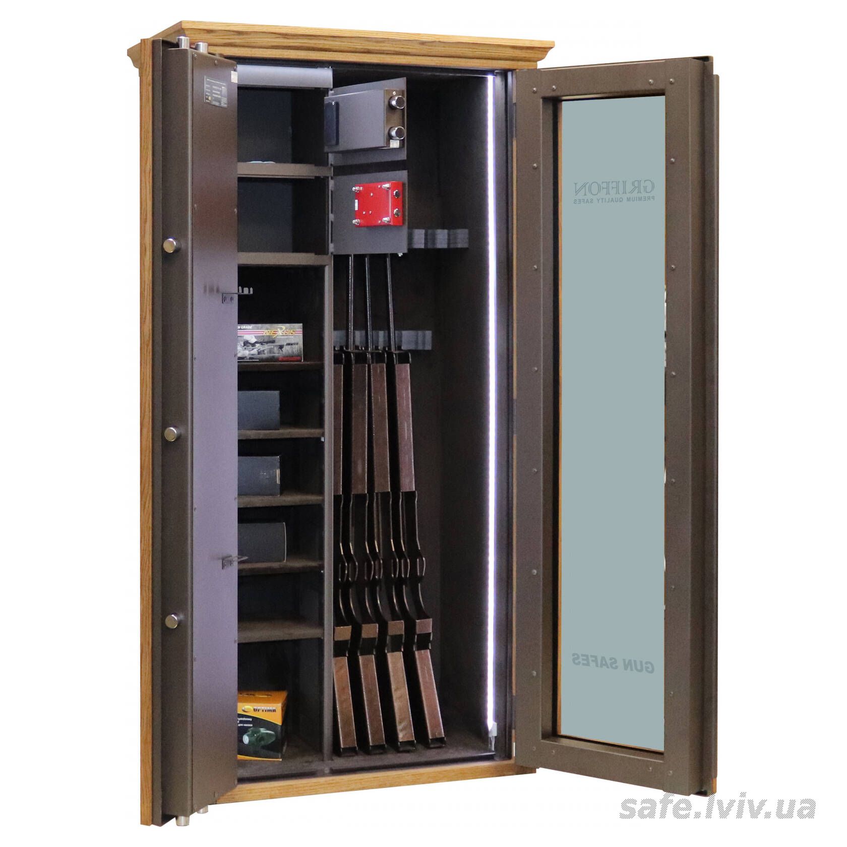 - Комплектація: пересувний ложемент під зброю з оптикою, 2 внутрішніх сейфи, внутрішнє оздоблення, 3 полиці, підсвітка; отвори для анкерування до стіни.