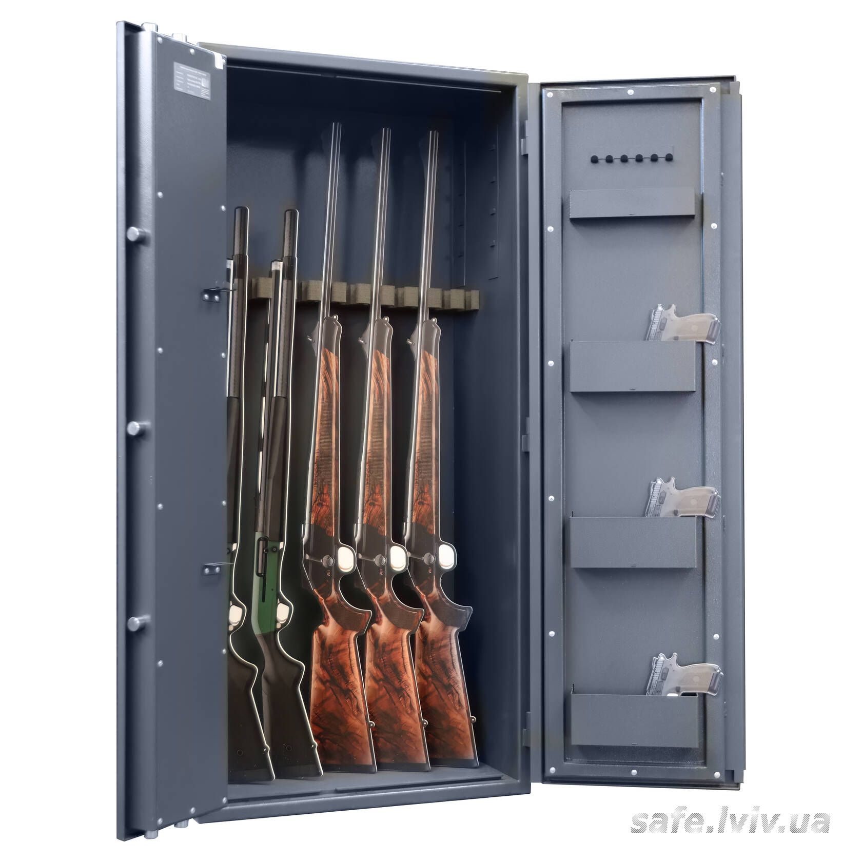 - Комплектація: пересувний ложемент під зброю з оптикою, тримачі для шомполів, 4 полиці; отвори для анкерування до стіни.