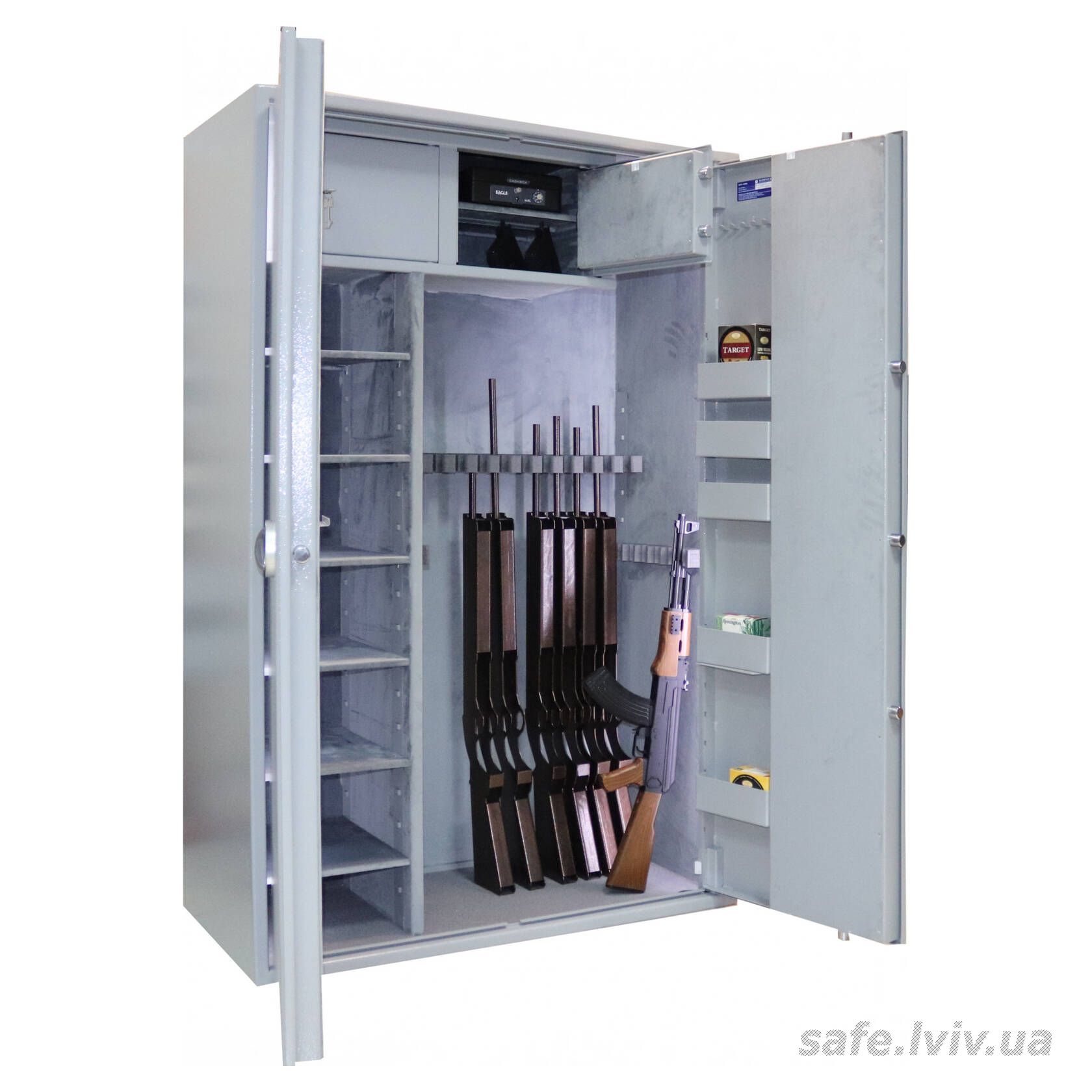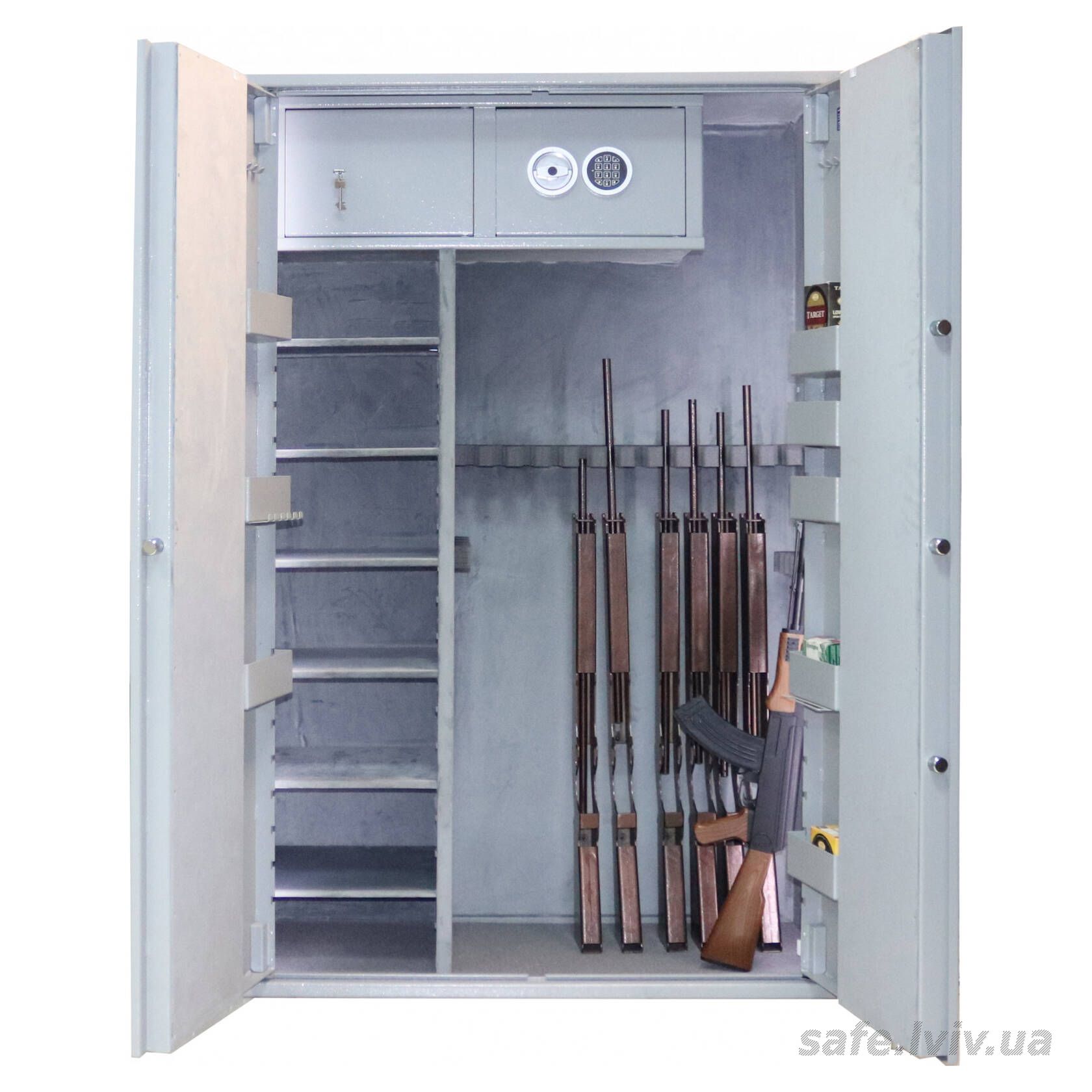 - Внутрішнє оснащення: пересувний ложемент під зброю з оптикою, 6 полиць, тримачі для шомполів, 2 внутрішніх сейфи, внутрішнє оздоблення, зйомні навісні елементи на дверях, підсвітка.