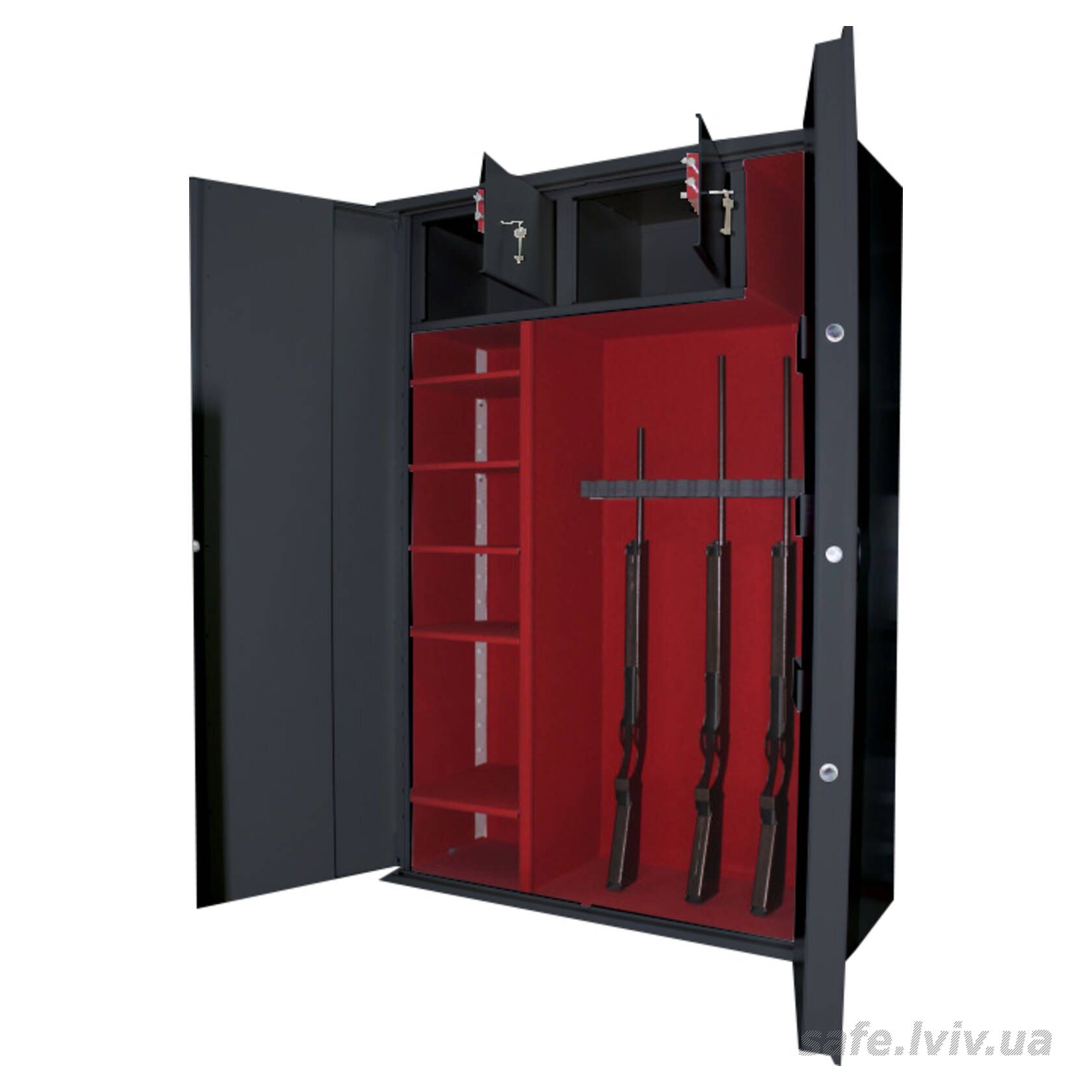 - Внутрішнє оснащення: пересувний ложемент під зброю з оптикою, 6 полиць, тримачі для шомполів, 2 внутрішніх сейфи, внутрішнє оздоблення, зйомні навісні елементи на дверях.