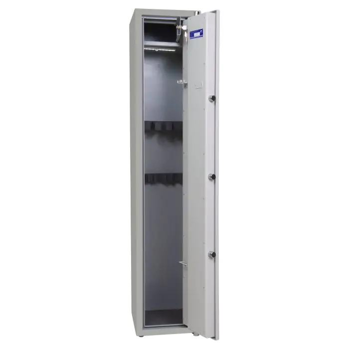 Griffon GE.300.K це сертифікований сейф клас S1 за EN 14450, призначений для безпечного зберігання мисливської та спортивної зброї, патронів і аксесуарів у домі або на об’єктах стрілецької інфраструктури. Базовий рівень захисту забезпечує конструкція корпусу 3 мм (сталь) у поєднанні з ригельною системою тристороння, 5 ригелів Ø 25 мм, антизламною конструкцією зачіп та внутрішньою петлею антизріз.