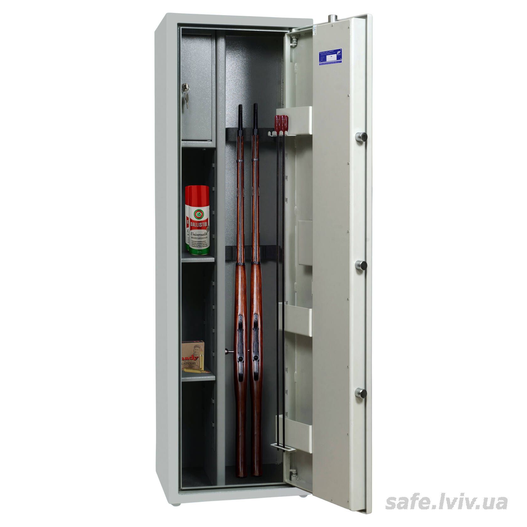 - Внутрішнє оснащення: пересувний ложемент під зброю з оптикою, тримачі для шомполів, трейзер, 3 полиці, зйомні навісні елементи на дверях.