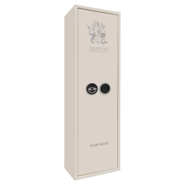 Griffon GE.450.E.L Cream це сертифікований сейф клас S1 за EN 14450, призначений для безпечного зберігання мисливської та спортивної зброї, патронів і аксесуарів у домі або на об’єктах стрілецької інфраструктури. Базовий рівень захисту забезпечує конструкція корпусу 3 мм (сталь) у поєднанні з ригельною системою тристороння, 5 ригелів Ø 25 мм, антизламною конструкцією зачіп та внутрішньою петлею антизріз.