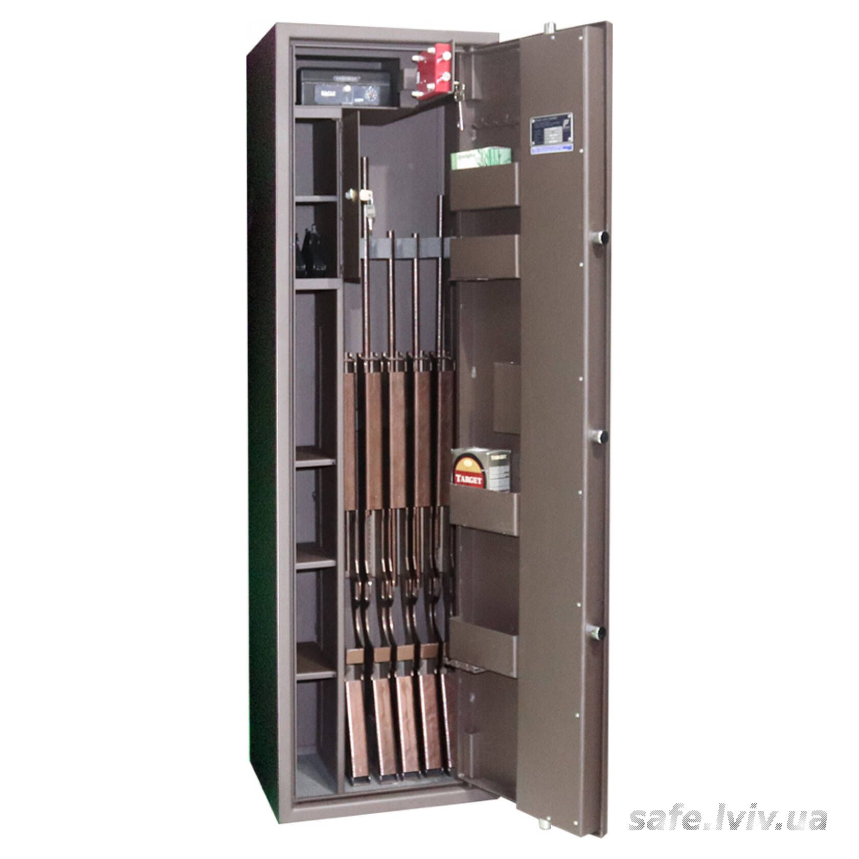 - Внутрішнє оснащення: пересувний ложемент під зброю з оптикою, тримачі для шомполів, 2 внутрішніх сейфи, 3 полиці, зйомні навісні елементи на дверях.