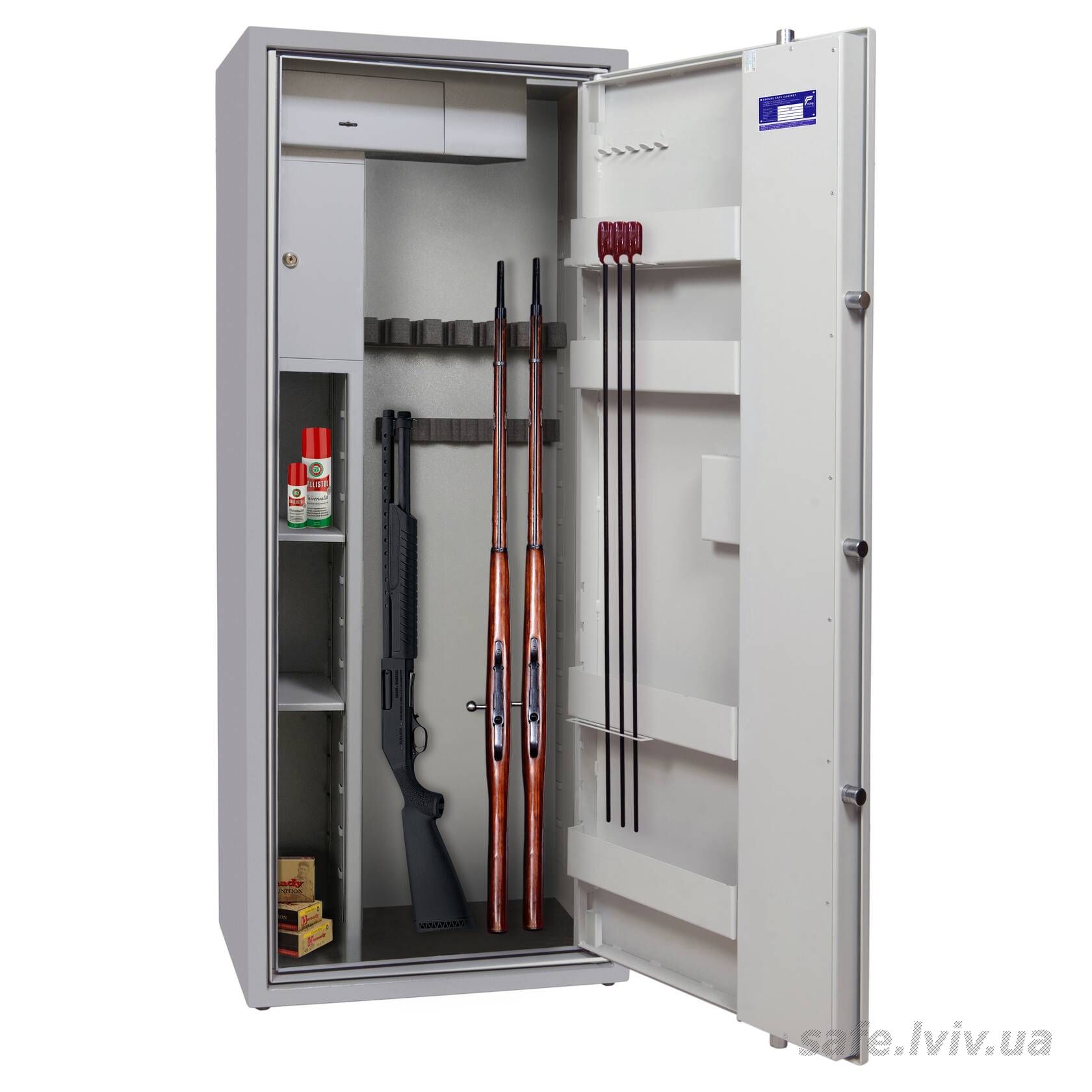 - Внутрішнє оснащення: пересувний ложемент під зброю з оптикою, тримачі для шомполів, 2 внутрішніх сейфи, 3 полиці, зйомні навісні елементи на дверях.