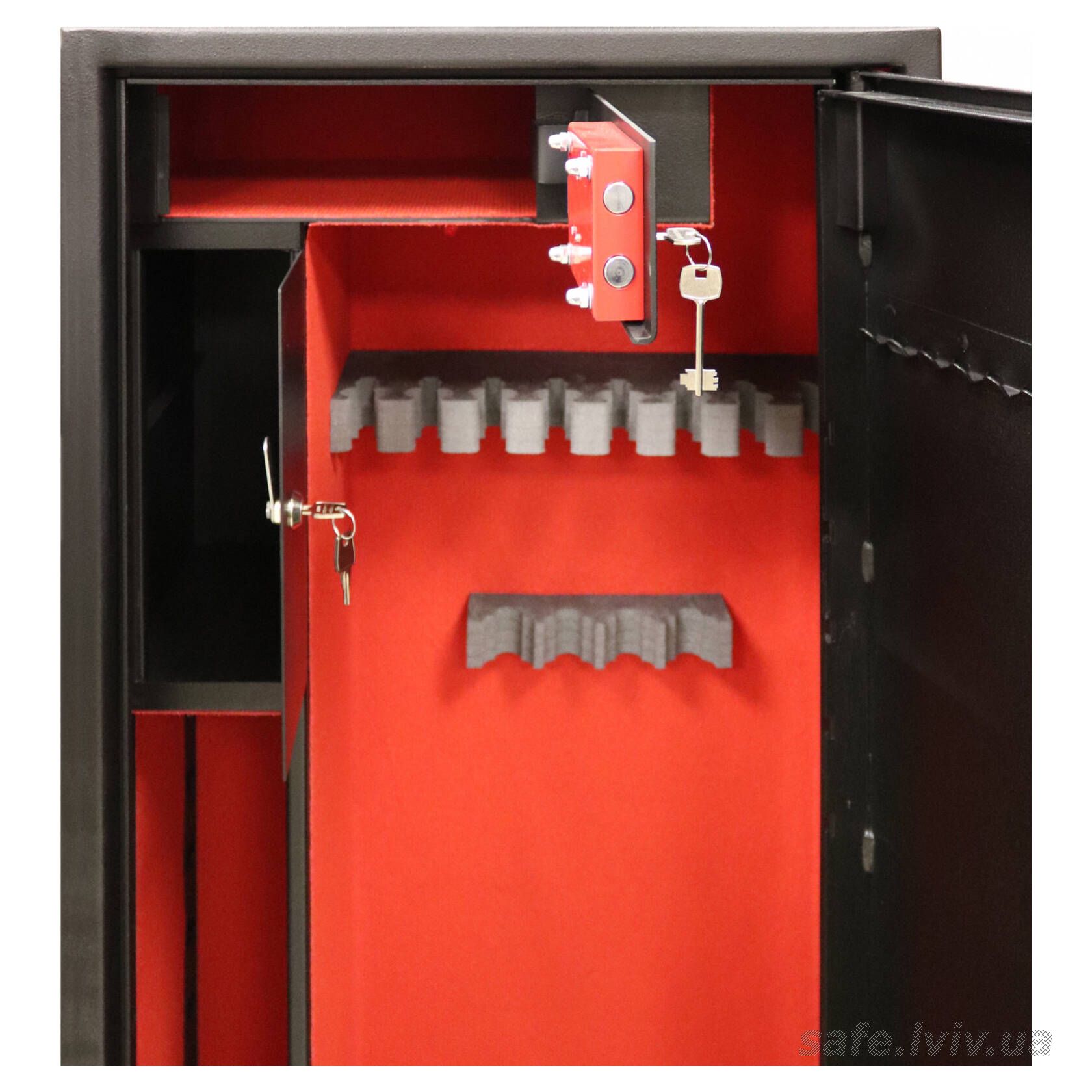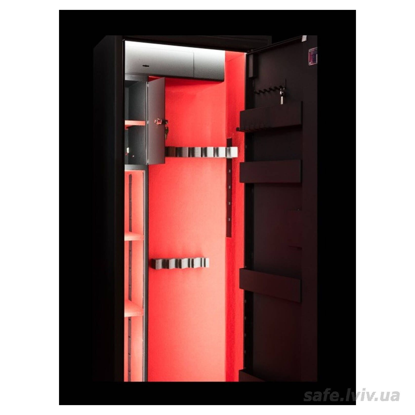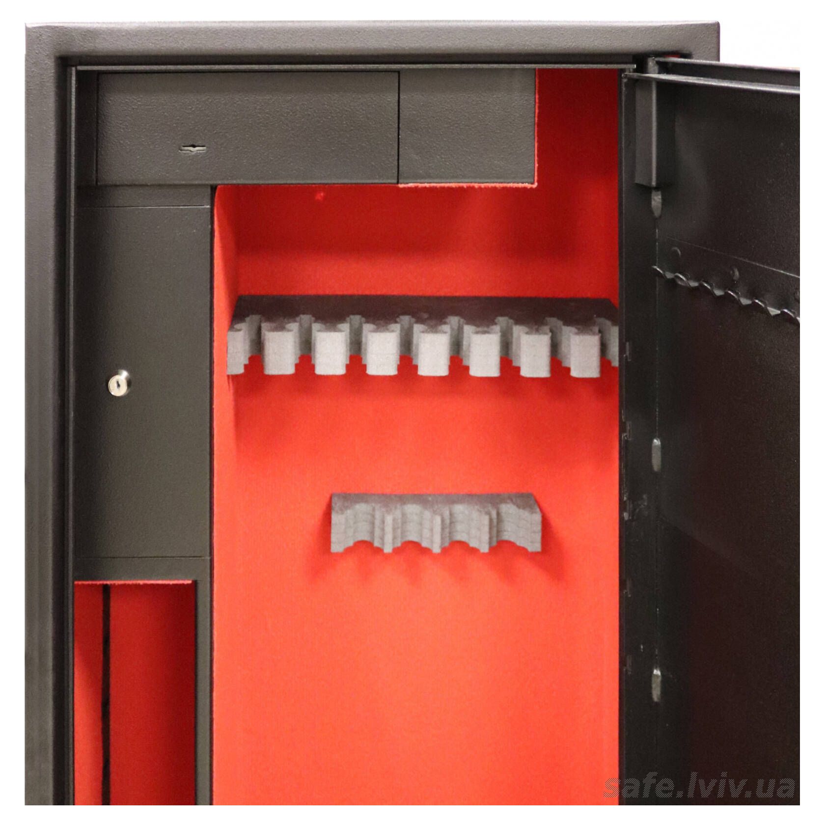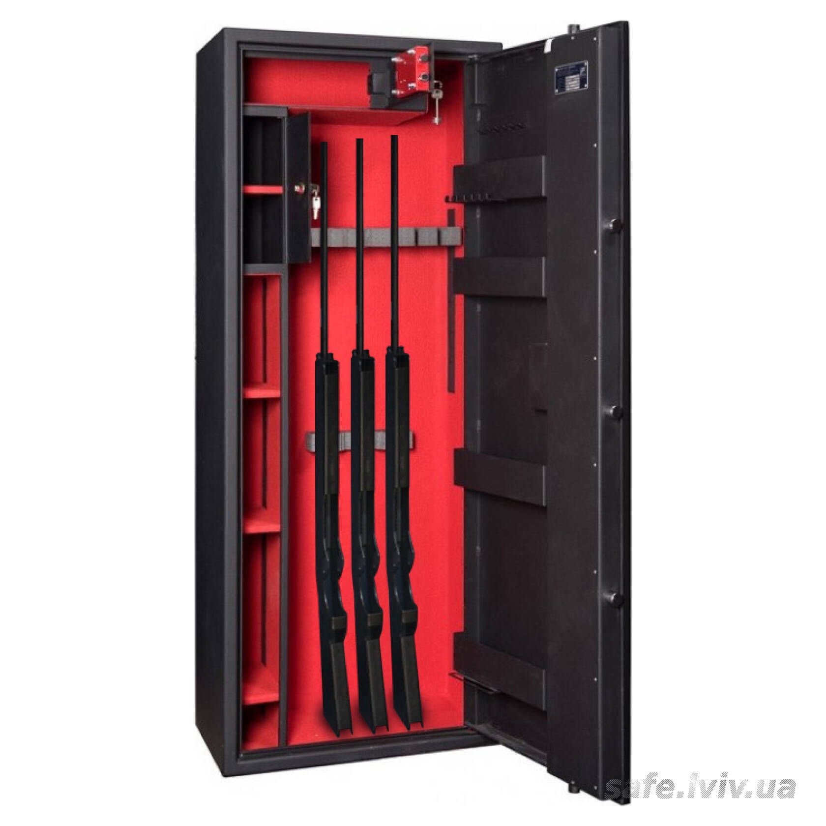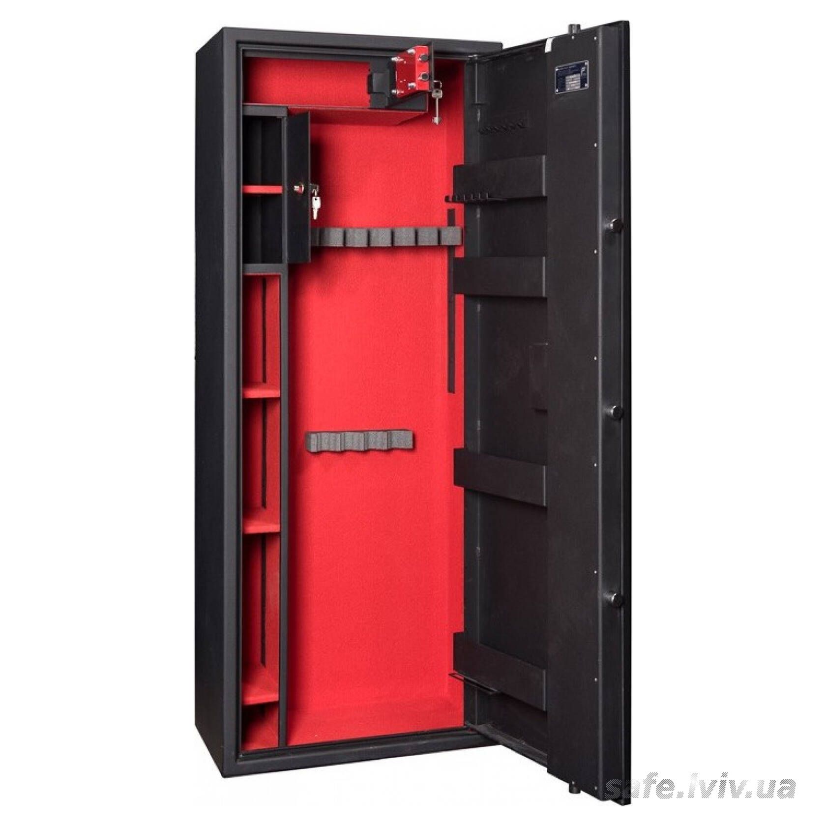 - Внутрішнє оснащення: пересувний ложемент під зброю з оптикою, тримачі для шомполів, 2 внутрішніх сейфи, 3 полиці, зйомні навісні елементи на дверях.