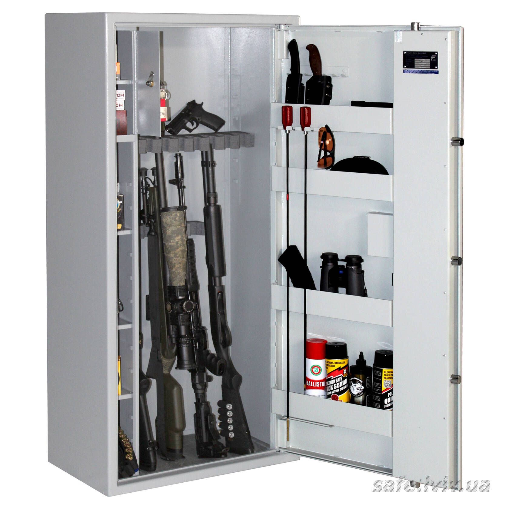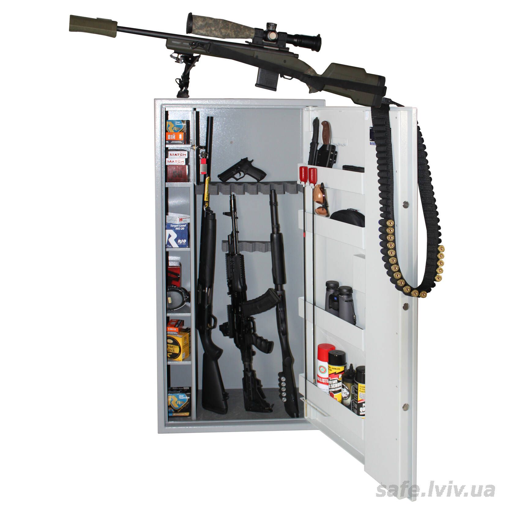 - Внутрішнє оснащення: пересувний ложемент під зброю з оптикою, тримачі для шомполів, трейзер, 3 полиці, зйомні навісні елементи на дверях.