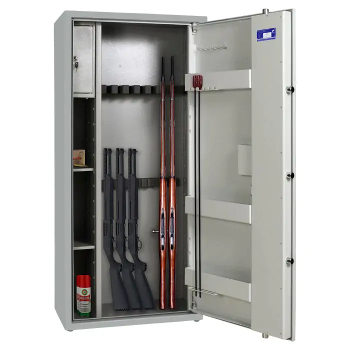 - Внутрішнє оснащення: пересувний ложемент під зброю з оптикою, тримачі для шомполів, трейзер, 3 полиці, зйомні навісні елементи на дверях.