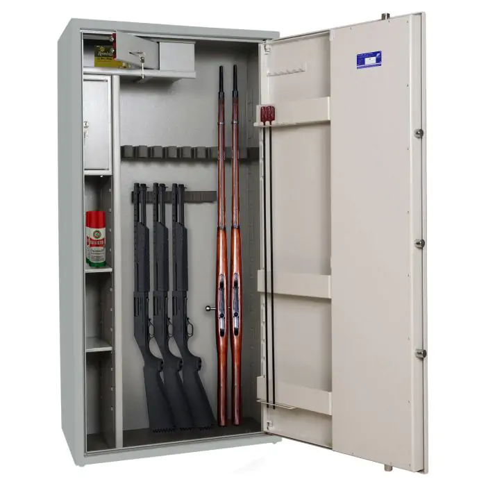 - Внутрішнє оснащення: пересувний ложемент під зброю з оптикою, тримачі для шомполів, 2 внутрішніх сейфи, 3 полиці, зйомні навісні елементи на дверях.