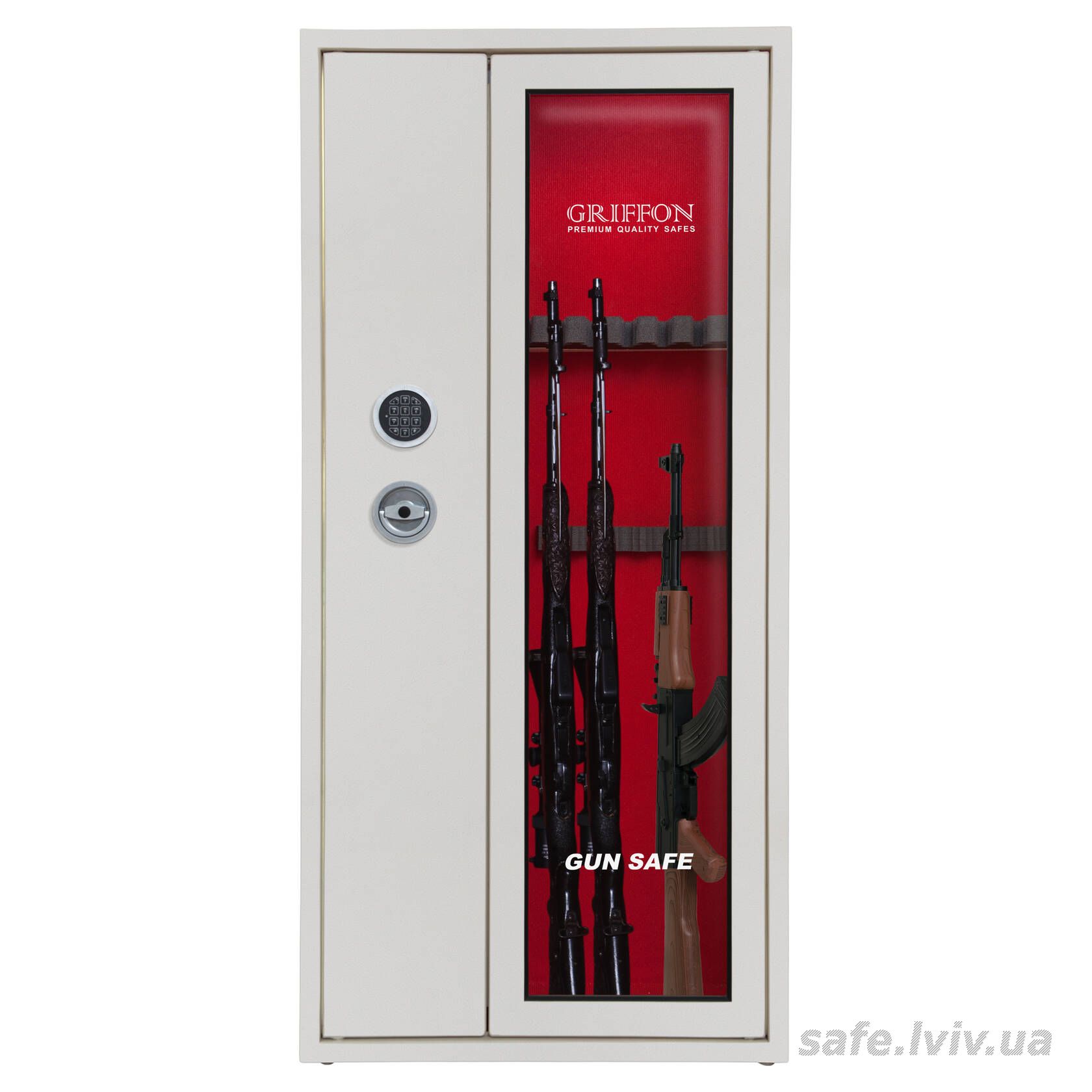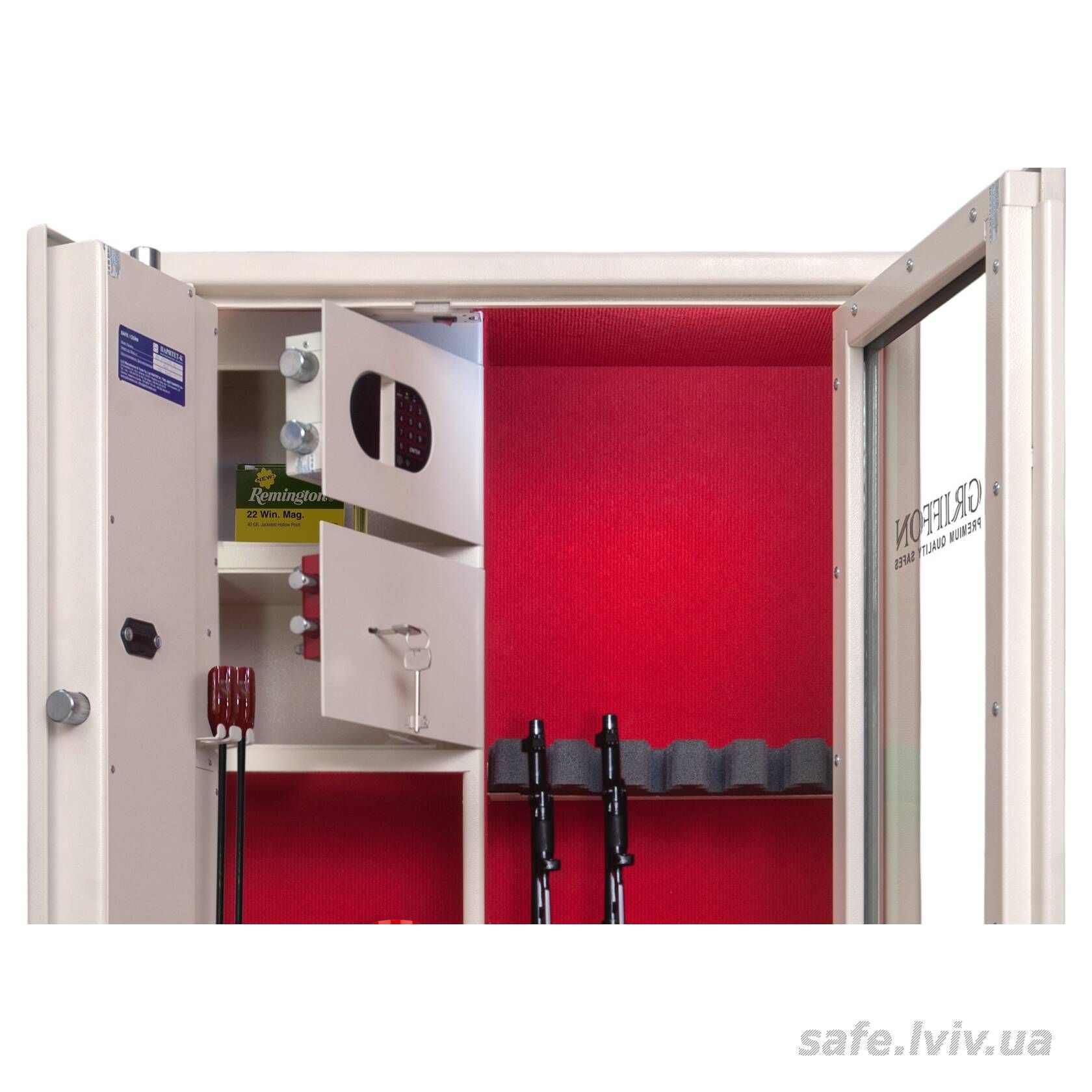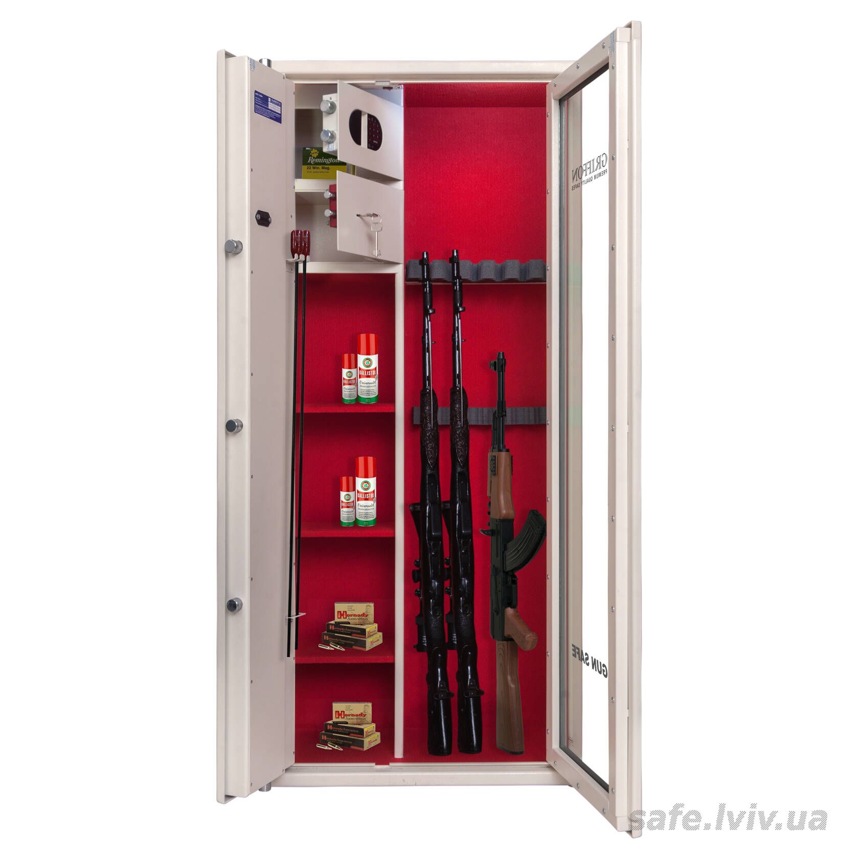 - Комплектація: пересувний ложемент під зброю з оптикою, тримачі для шомполів, 2 внутрішніх сейфи, внутрішнє оздоблення, 3 полиці, підсвітка.