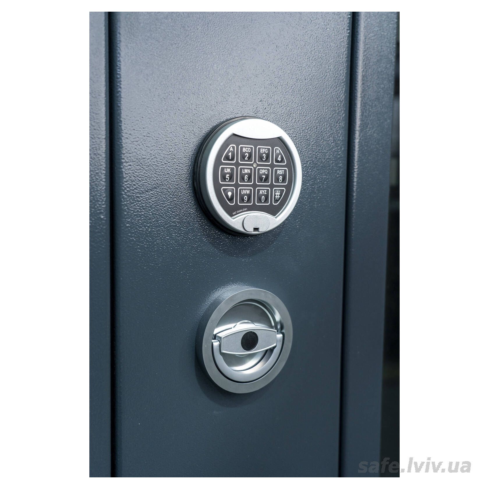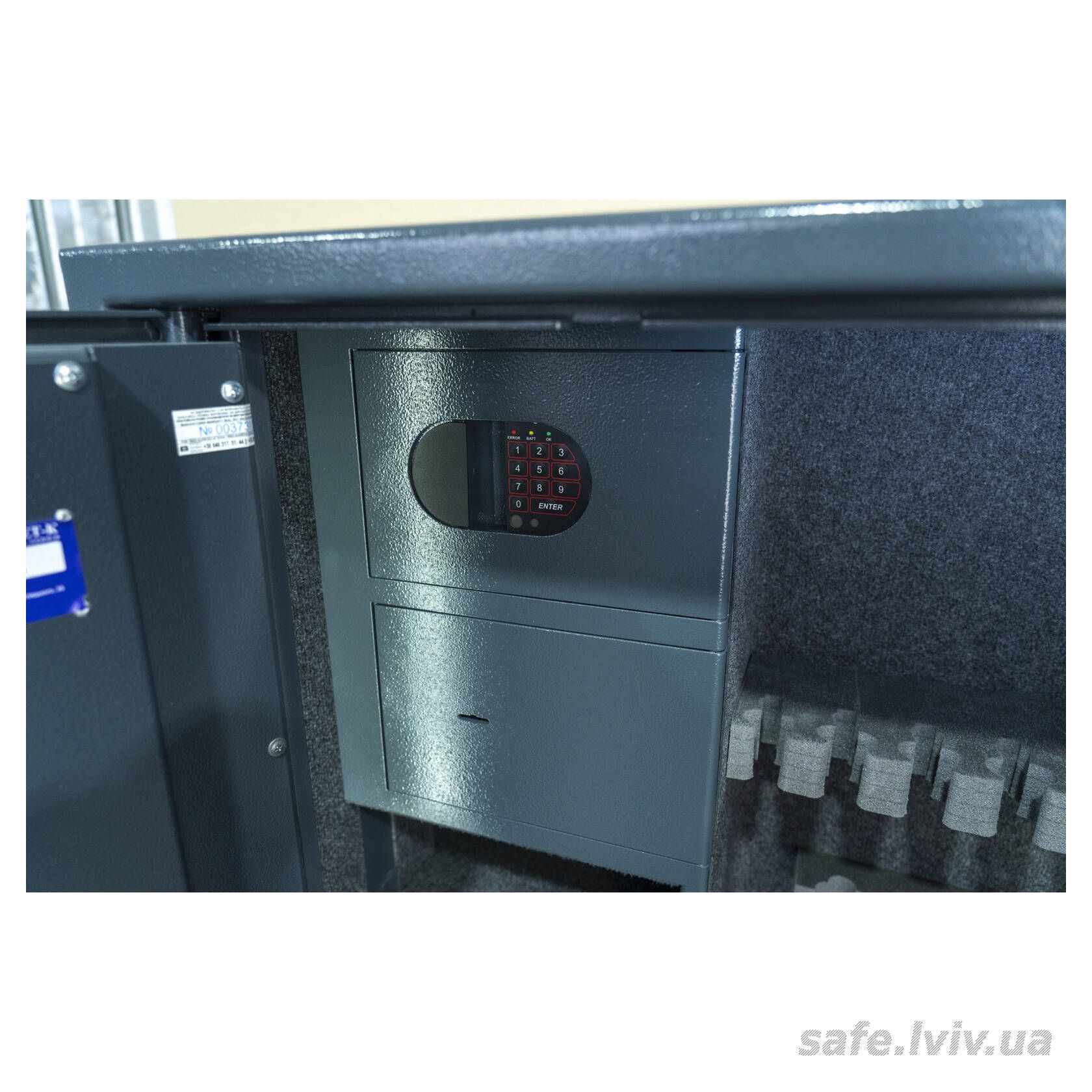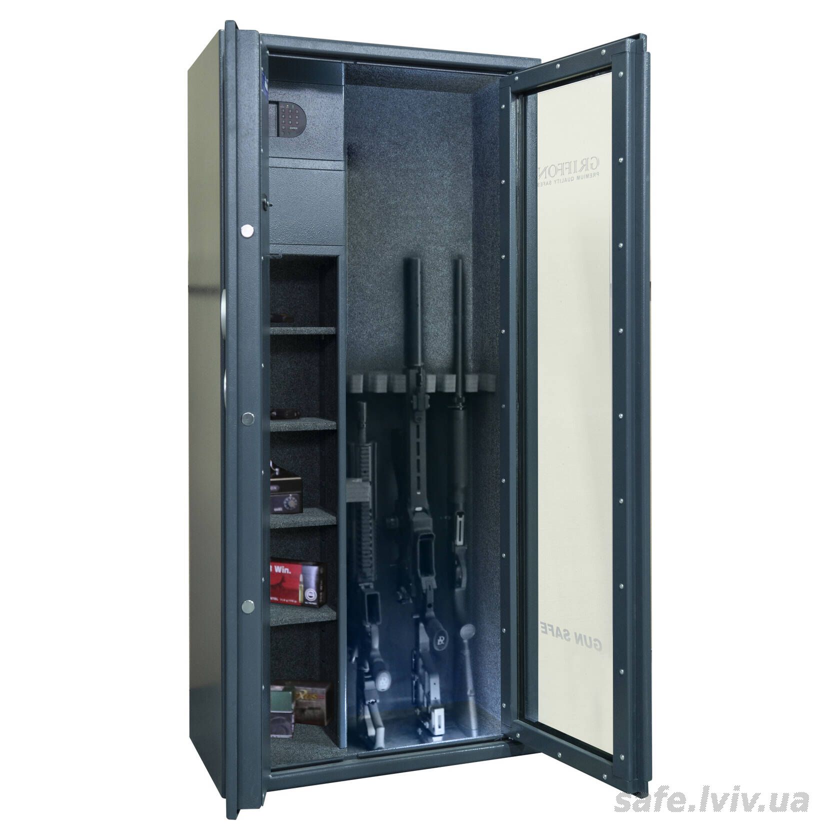 - Комплектація: пересувний ложемент під зброю з оптикою, тримачі для шомполів, 2 внутрішніх сейфи, внутрішнє оздоблення, 4 полиці, підсвітка.
