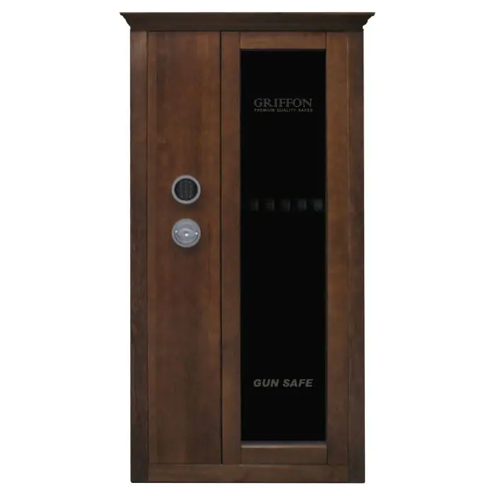 Griffon GG.700.E Dark Wood - це зламостійкий збройовий сейф клас S1 за EN 14450, сертифікований у європейській лабораторії WIT, призначений для зберігання та демонстрації мисливської і спортивної зброї. Зламостійкість забезпечує конструкція корпусу 3 мм (сталь), дверей 22 мм (ударотривке скло) і ригельна система . Додатковий захист надають антизламна система зачіп і внутрішня петля-антизріз. Вогнестійкість - без вогнестійкості.