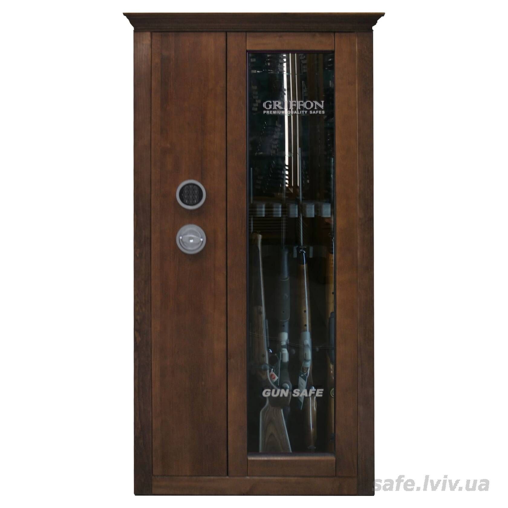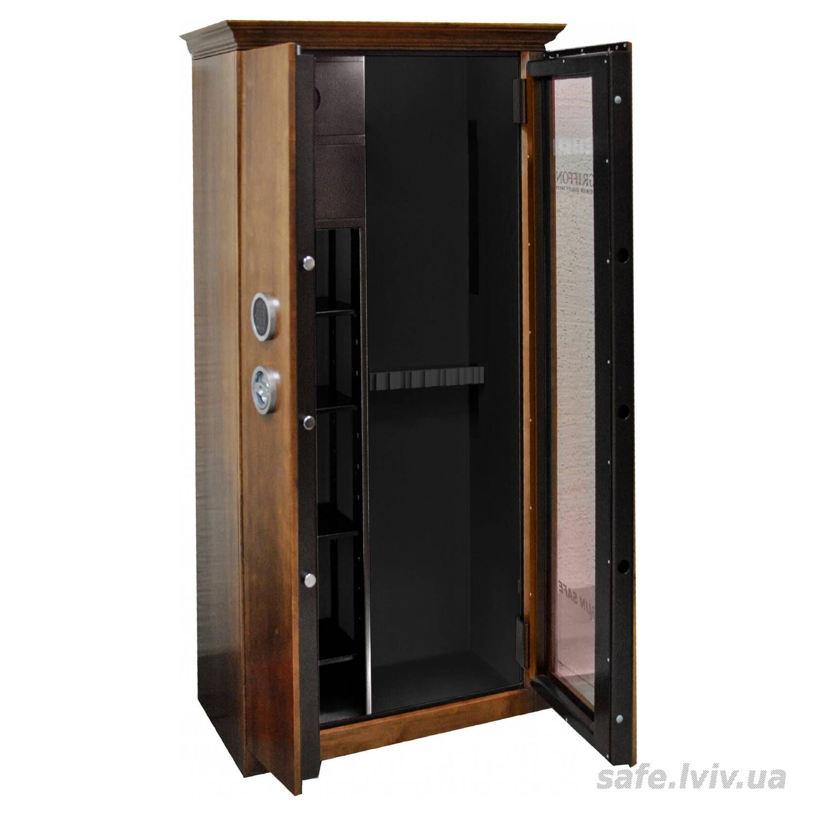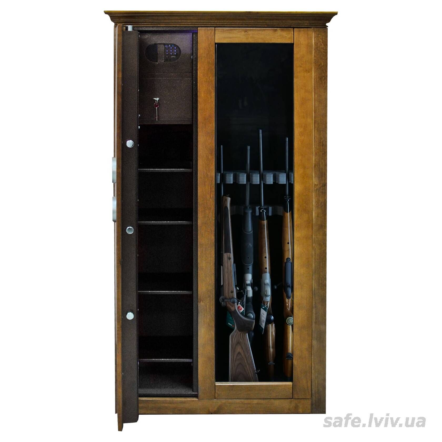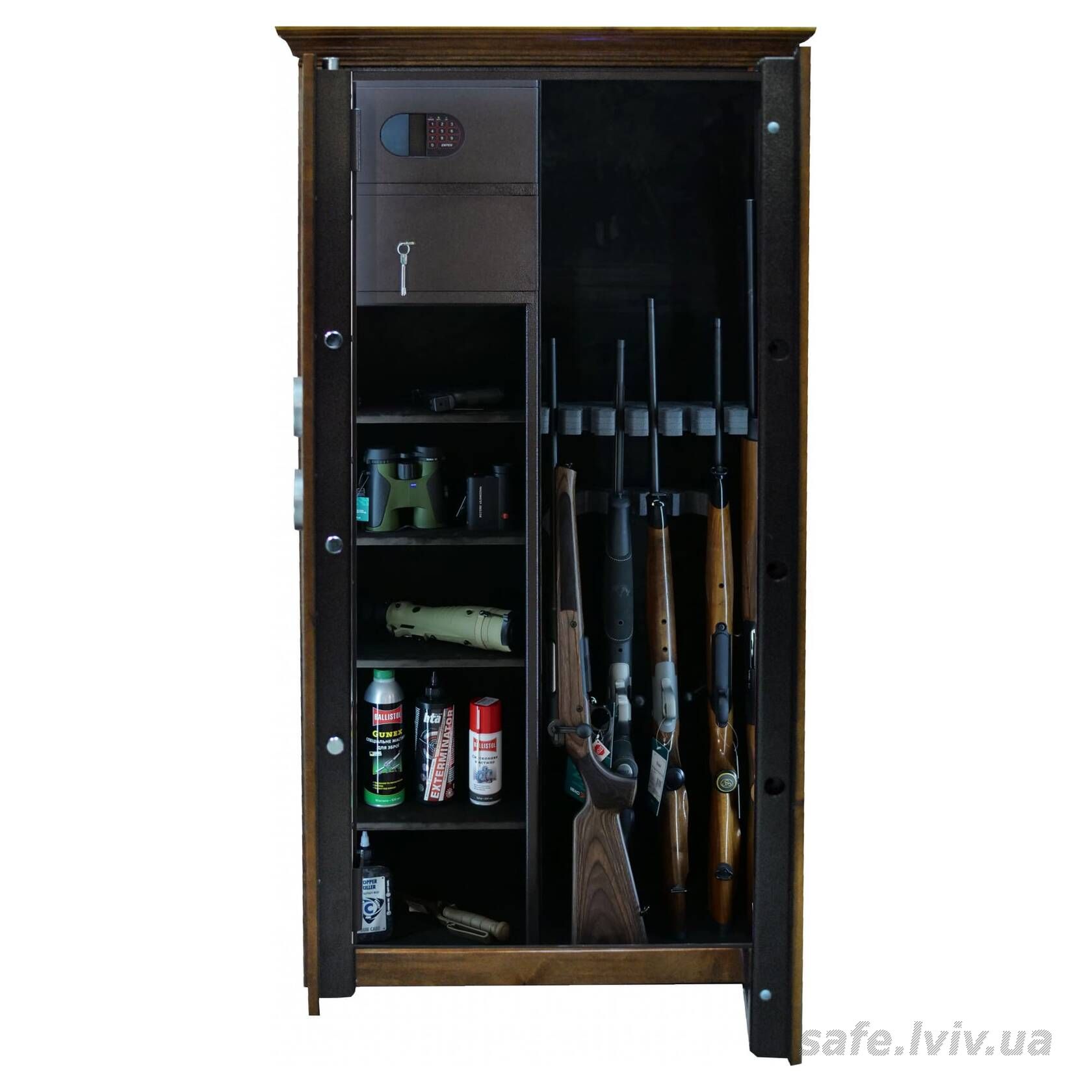 - Комплектація: зовнішнє оздоблення, пересувний ложемент під зброю з оптикою, тримачі для шомполів, 2 внутрішніх сейфи, внутрішнє оздоблення, 4 полиці, підсвітка.