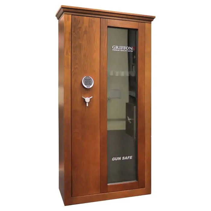 Griffon GG.700.E EM Wood Ash - це зламостійкий збройовий сейф клас S1 за EN 14450, сертифікований у європейській лабораторії WIT, призначений для зберігання та демонстрації мисливської і спортивної зброї. Зламостійкість забезпечує конструкція корпусу 3 мм (сталь), дверей 22 мм (ударотривке скло) і ригельна система . Додатковий захист надають антизламна система зачіп і внутрішня петля-антизріз. Вогнестійкість - без вогнестійкості.