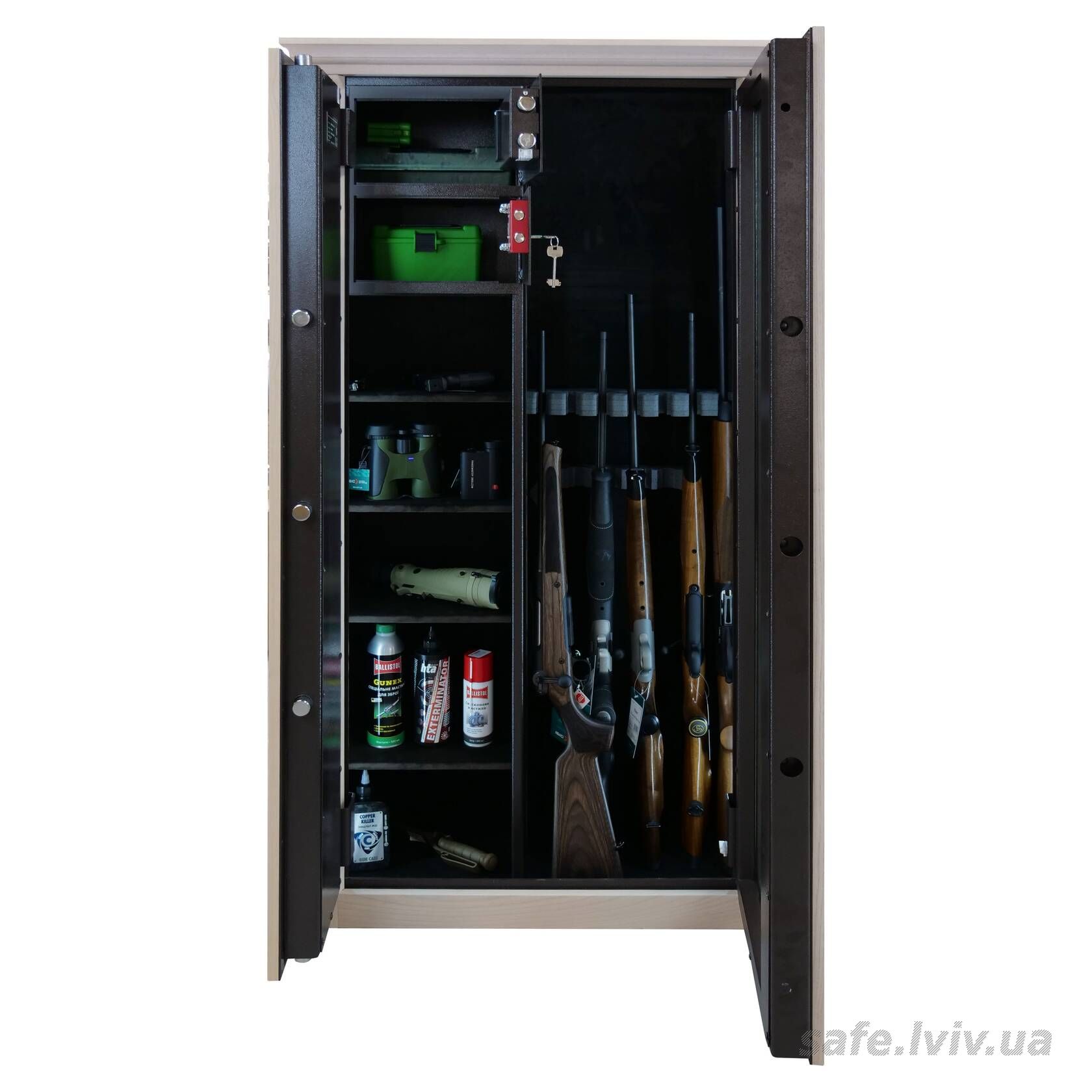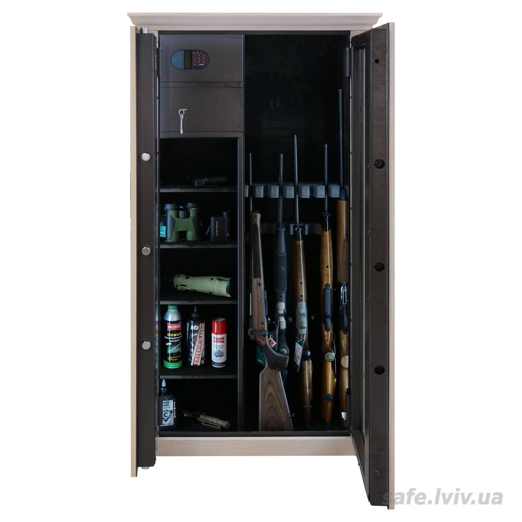 - Комплектація: зовнішнє оздоблення, пересувний ложемент під зброю з оптикою, тримачі для шомполів, 2 внутрішніх сейфи, внутрішнє оздоблення, 4 полиці, підсвітка.