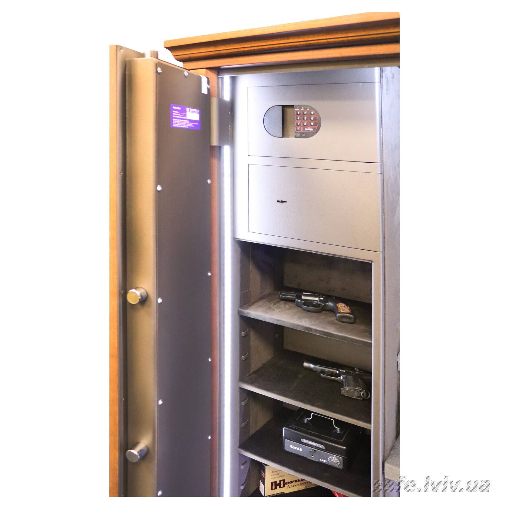 - Комплектація: зовнішнє оздоблення, пересувний ложемент під зброю з оптикою, тримачі для шомполів, 2 внутрішніх сейфи, внутрішнє оздоблення, 4 полиці, підсвітка.
