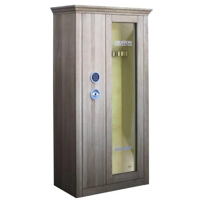 Griffon GG.700.E Wood Oak - це зламостійкий збройовий сейф клас S1 за EN 14450, сертифікований у європейській лабораторії WIT, призначений для зберігання та демонстрації мисливської і спортивної зброї. Зламостійкість забезпечує конструкція корпусу 3 мм (сталь), дверей 22 мм (ударотривке скло) і ригельна система . Додатковий захист надають антизламна система зачіп і внутрішня петля-антизріз. Вогнестійкість - без вогнестійкості.