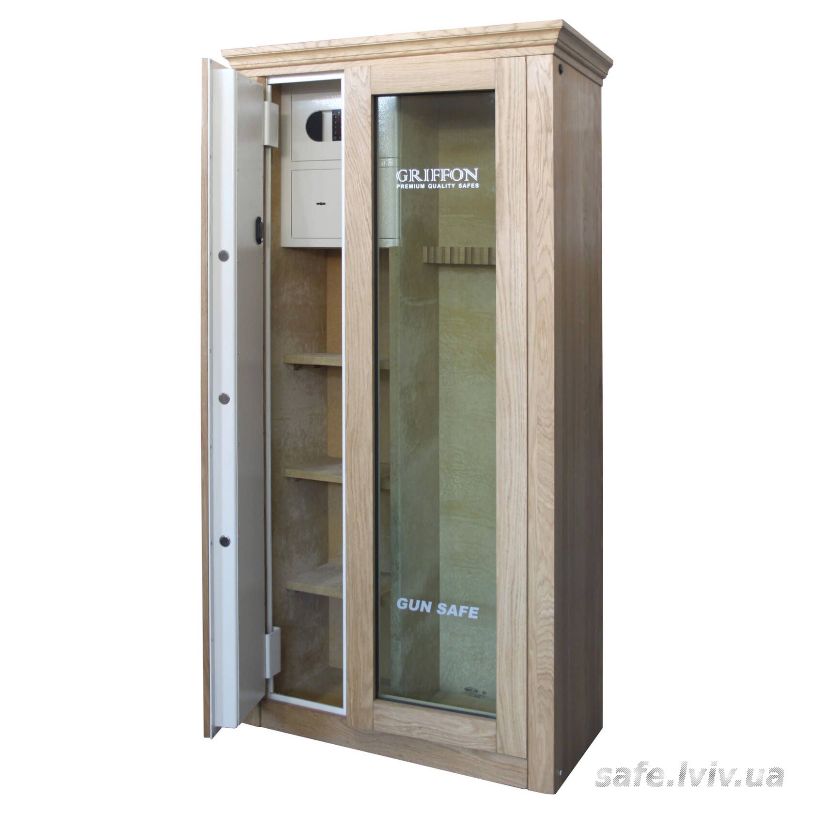 - Комплектація: зовнішнє оздоблення, пересувний ложемент під зброю з оптикою, тримачі для шомполів, 2 внутрішніх сейфи, внутрішнє оздоблення, 3 полиці, підсвітка.