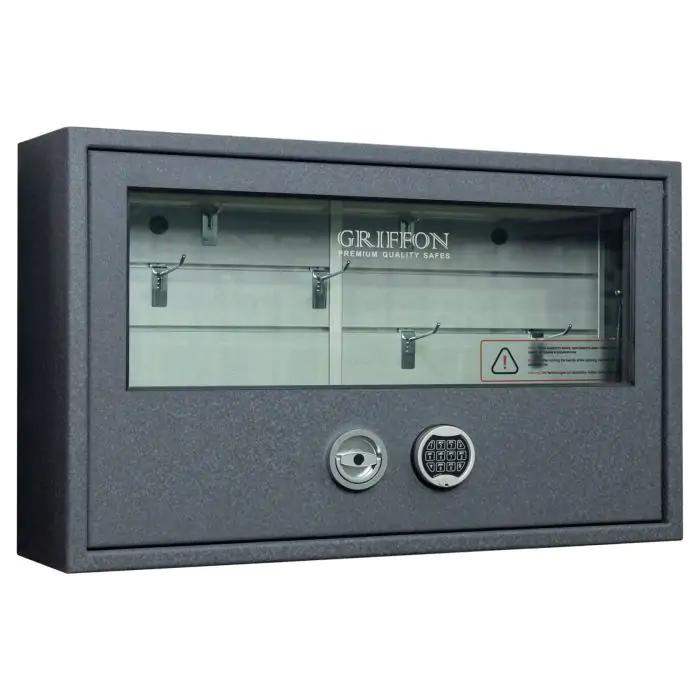 Griffon GG.W.64/130.E - це зламостійкий збройовий сейф клас S1 за EN 14450, сертифікований у європейській лабораторії WIT, призначений для зберігання та демонстрації мисливської і спортивної зброї. Зламостійкість забезпечує конструкція корпусу 3 мм (сталь), дверей 22 мм (ударотривке скло) і ригельна система . Додатковий захист надають антизламна система зачіп і внутрішня петля-антизріз. Вогнестійкість - без вогнестійкості.