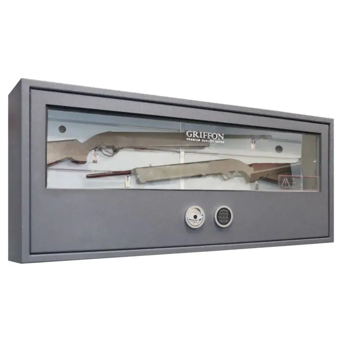 Griffon GG.W.64/150.E - це зламостійкий збройовий сейф клас S1 за EN 14450, сертифікований у європейській лабораторії WIT, призначений для зберігання та демонстрації мисливської і спортивної зброї. Зламостійкість забезпечує конструкція корпусу 3 мм (сталь), дверей 22 мм (ударотривке скло) і ригельна система тристороння, 5 ригелів Ø 25 мм. Додатковий захист надають антизламна система зачіп і внутрішня петля-антизріз. Вогнестійкість - без вогнестійкості.